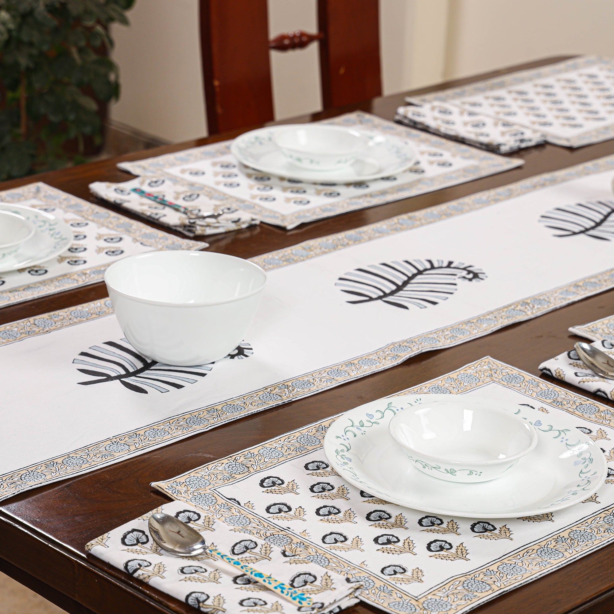 Introducing our exquisite white sanganeri block printed cotton table runner, table mat & napkin set. Crafted using the traditional hand-block printing technique from Sanganer, Jaipur, each piece showcases intricate designs and vibrant colors. Made with bleed-free VAT dyes, these high-quality textiles add elegance and charm to any dining experience.