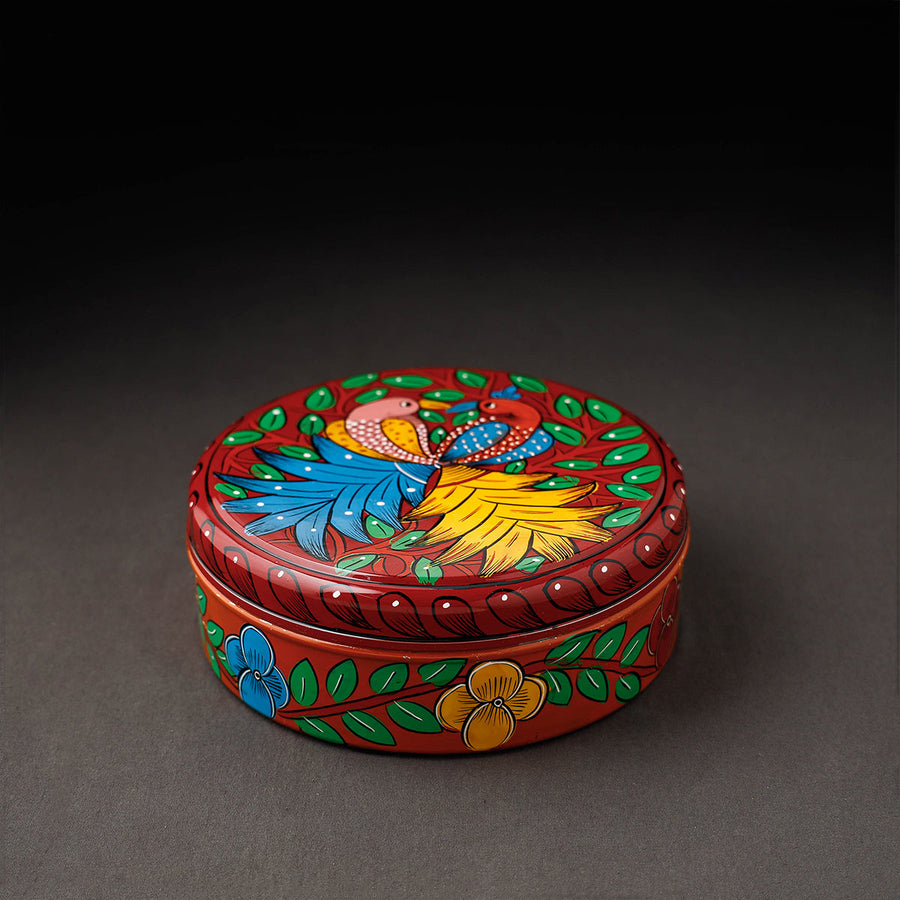 Indulge the exquisite red patua hand-painted masala box, a true masterpiece created by the skilled artisans of West Bengal. This masala box is a harmonious blend of artistry and functionality, designed to add a touch of elegance to your kitchen.