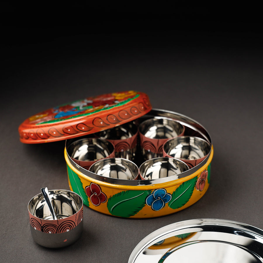 Indulge the exquisite multicolor patua hand-painted masala box, a true masterpiece created by the skilled artisans of West Bengal. This masala box is a harmonious blend of artistry and functionality, designed to add a touch of elegance to your kitchen.