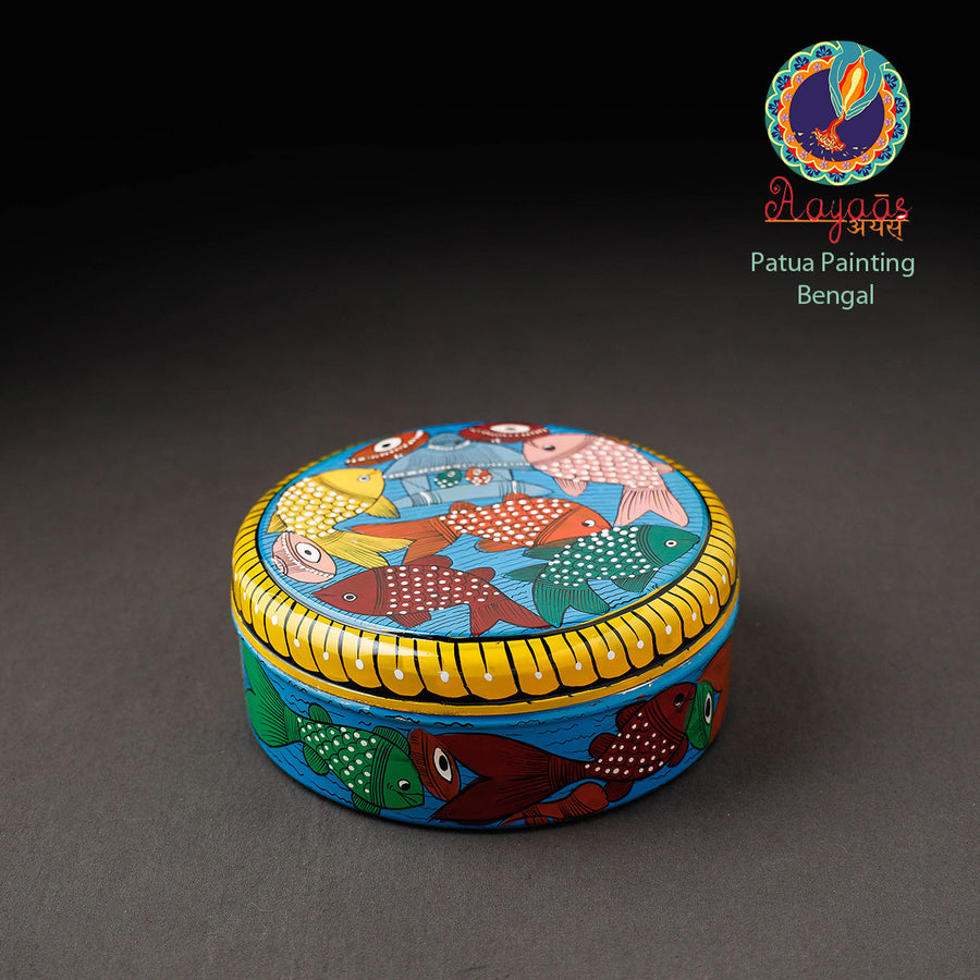 Indulge the exquisite blue patua hand-painted masala box, a true masterpiece created by the skilled artisans of West Bengal. This masala box is a harmonious blend of artistry and functionality, designed to add a touch of elegance to your kitchen.
