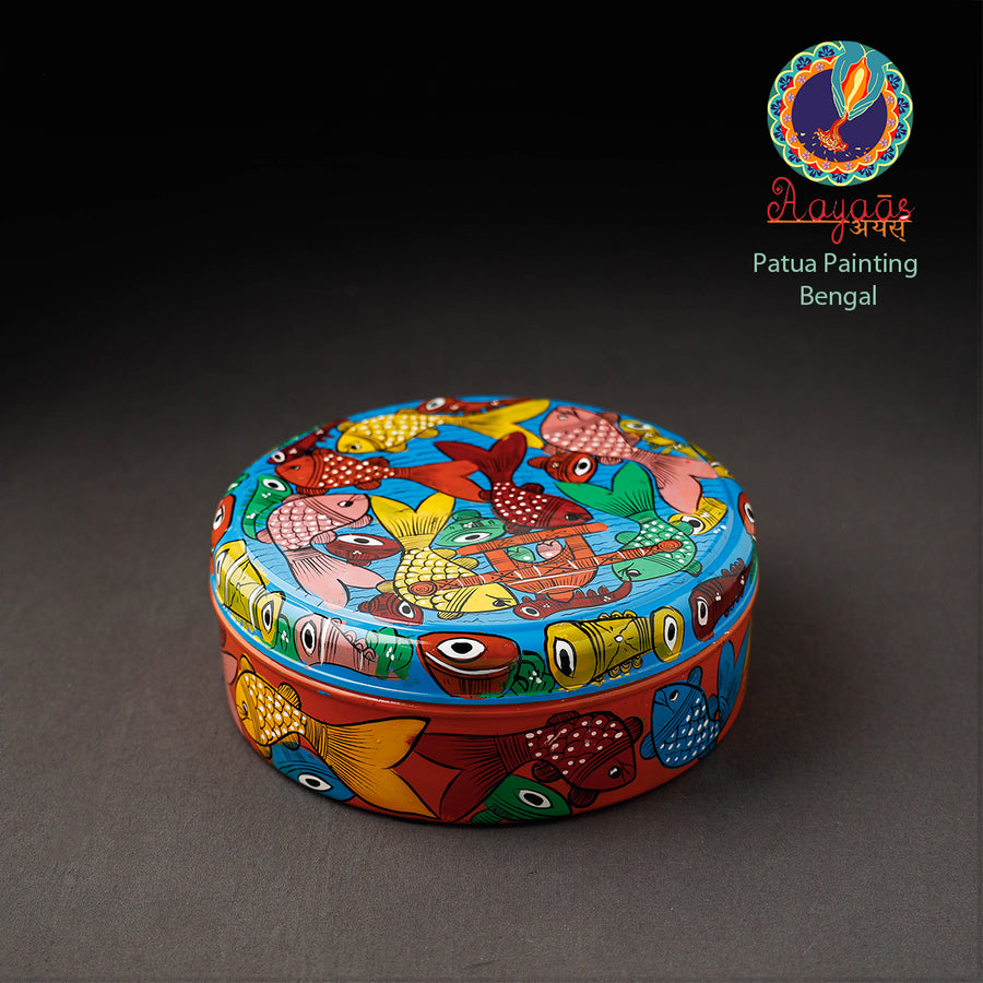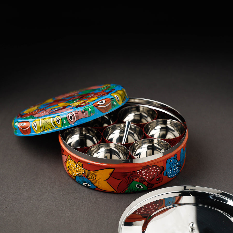 Indulge the exquisite multicolor patua hand-painted masala box, a true masterpiece created by the skilled artisans of West Bengal. This masala box is a harmonious blend of artistry and functionality, designed to add a touch of elegance to your kitchen.