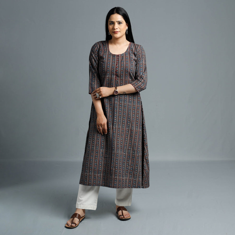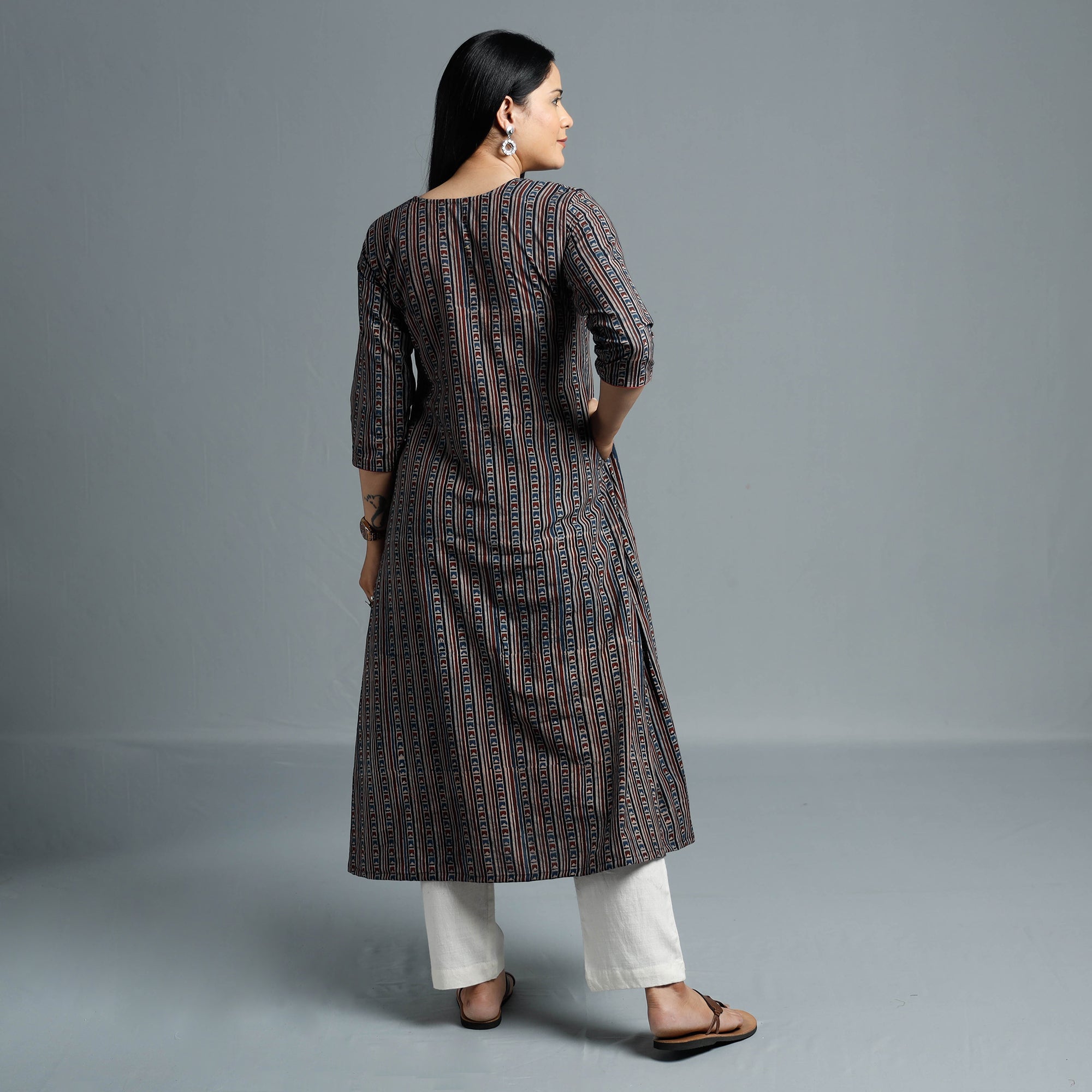 Look and feel beautiful in this uniquely designed ajrakh printed cotton long Kurta with one side pocket. This cotton Kurta makes you comfortable with ease all day long. Ajrakh is a traditional vegetable dyeing and resist block-printing technique on cloth. It is estimated to be around 4,500 years old. The Ajrakh artisans in India are originally from Sindh and they migrated to Kutch in Gujarat and Barmer in Rajasthan. Ajrakh is the traditional attire of the Maldhari pastoral community of Bhuj. The process of 'Ajrakh' is a long drawn process with many stages and each layer of colour is printed after a gap of time so the cloth has to stay for the day.