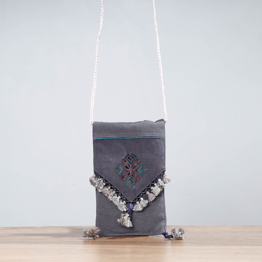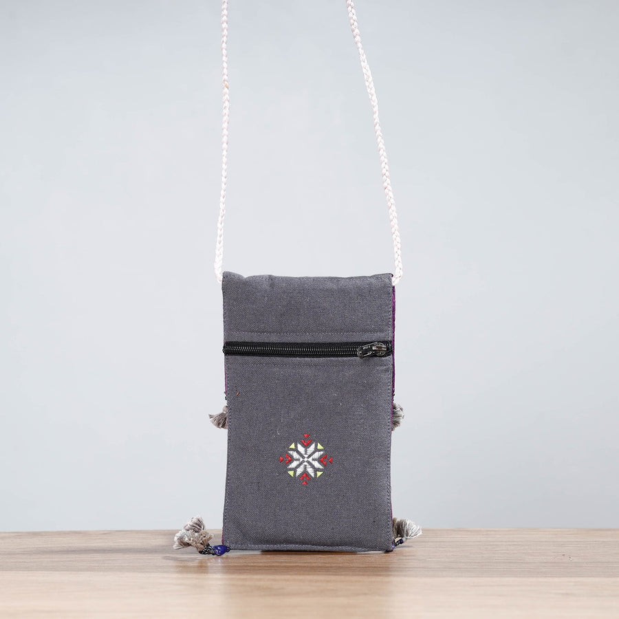 This grey exquisite soof hand embroidery handloom cotton sling flap mobile pouch, crafted by the skilled artisans of Kutch, showcases the best of Gujarat's embroidery traditions. The vibrant colours add a touch of elegance to the mobile pouch. With one zipper pocket on the outside, it offers ample space to keep your small essentials organised. Soof embroidery is meticulously crafted by skilled artisans. The surface satin stitch is worked from the back of the fabric, counting the weave and inserting the needle at regular intervals. The designs are created spontaneously, showcasing the craftswomen's geometric expertise and creativity.