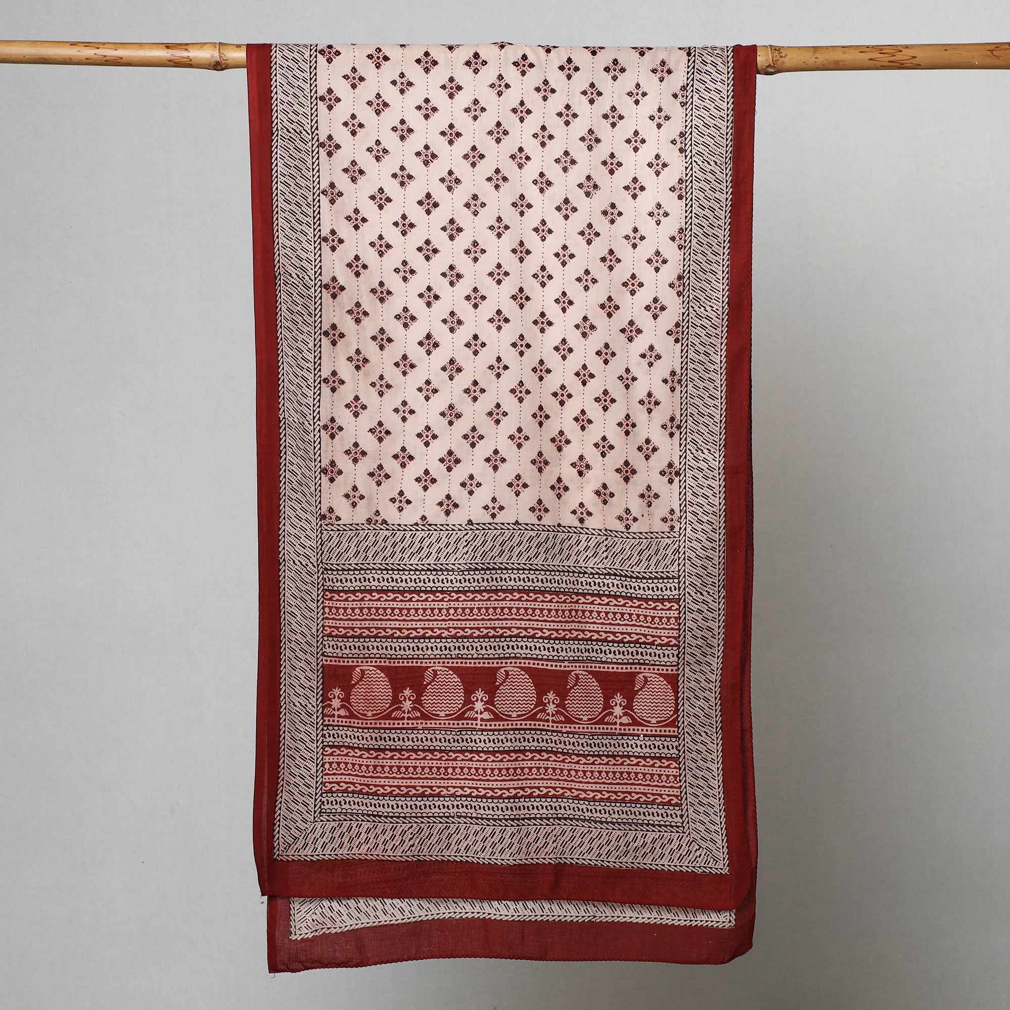 Elevate your style with the special red bagh block printed cotton stole crafted by the skilled artisan Bilal Khatri. This stole is a masterpiece created using natural dyes and the traditional handblock printing technique practiced in Bagh, Madhya Pradesh. Made with exquisite attention to detail, the stole showcases the beauty of natural dyed cotton and adds a touch of elegance to your everyday attire, leaving a lasting impression wherever you go.
