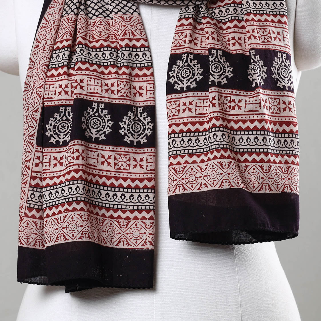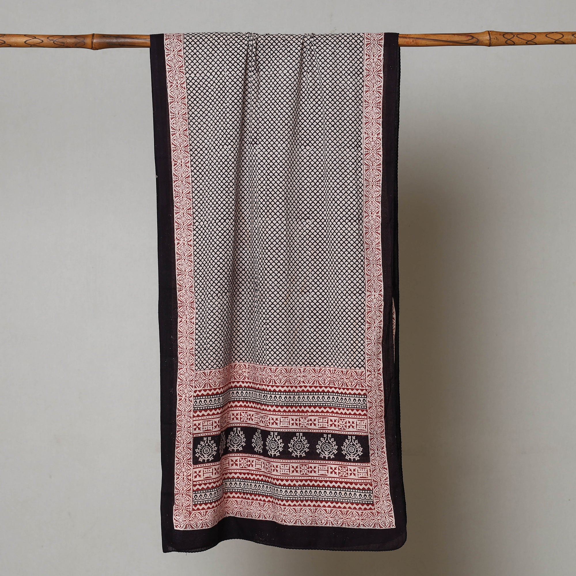 Elevate your style with the special black bagh block printed cotton stole crafted by the skilled artisan Bilal Khatri. This stole is a masterpiece created using natural dyes and the traditional handblock printing technique practiced in Bagh, Madhya Pradesh. Made with exquisite attention to detail, the stole showcases the beauty of natural dyed cotton and adds a touch of elegance to your everyday attire, leaving a lasting impression wherever you go.