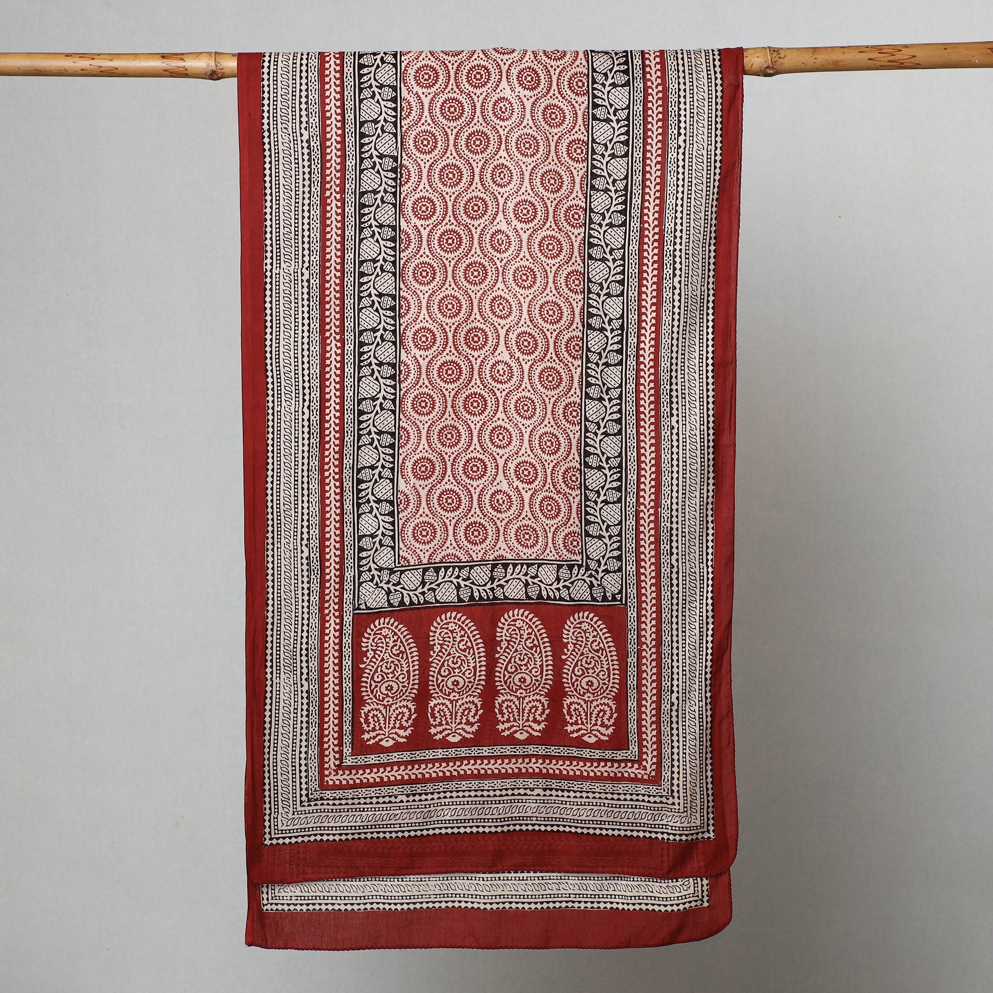 Elevate your style with the special red bagh block printed cotton stole crafted by the skilled artisan Bilal Khatri. This stole is a masterpiece created using natural dyes and the traditional handblock printing technique practiced in Bagh, Madhya Pradesh. Made with exquisite attention to detail, the stole showcases the beauty of natural dyed cotton and adds a touch of elegance to your everyday attire, leaving a lasting impression wherever you go.