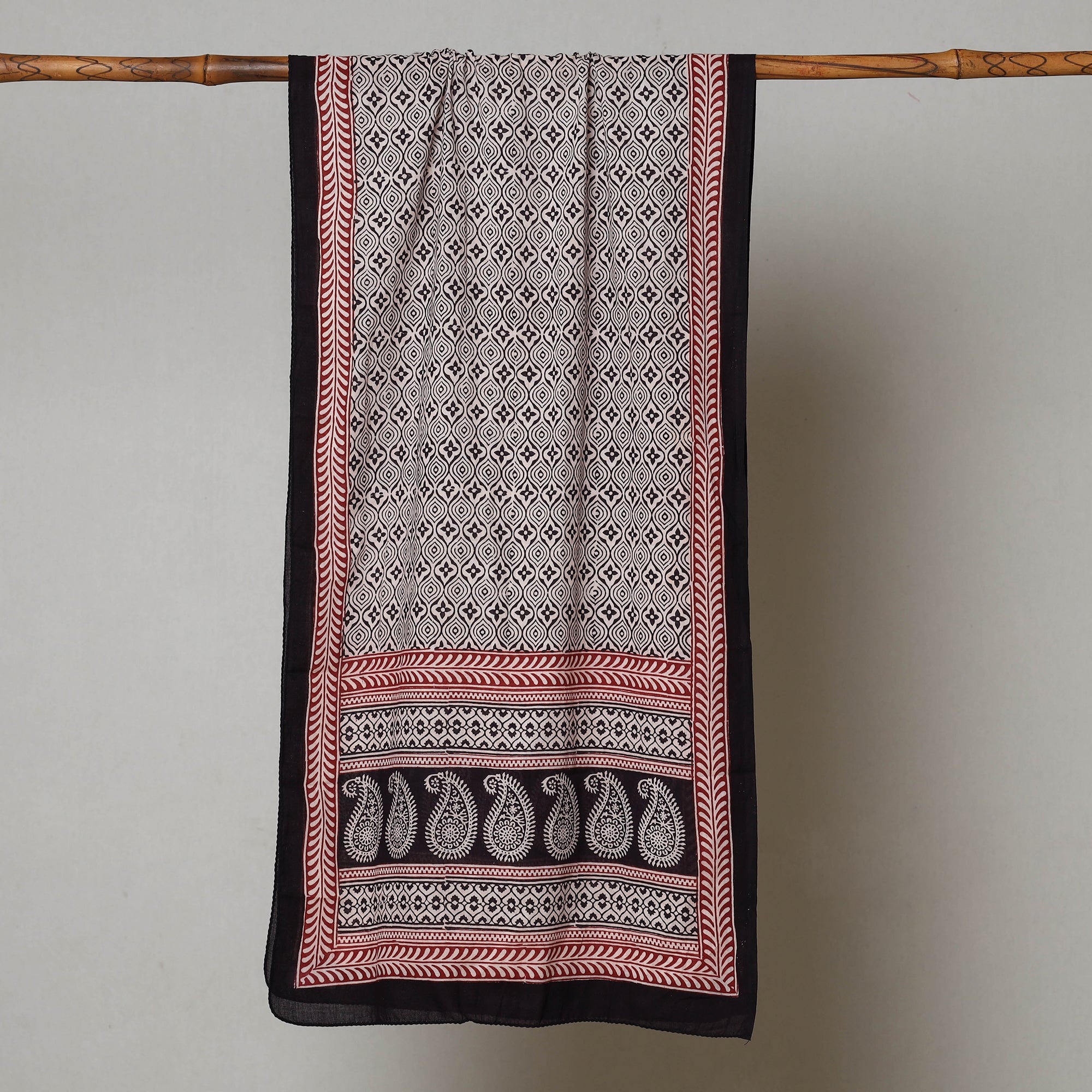 Elevate your style with the special black bagh block printed cotton stole crafted by the skilled artisan Bilal Khatri. This stole is a masterpiece created using natural dyes and the traditional handblock printing technique practiced in Bagh, Madhya Pradesh. Made with exquisite attention to detail, the stole showcases the beauty of natural dyed cotton and adds a touch of elegance to your everyday attire, leaving a lasting impression wherever you go.