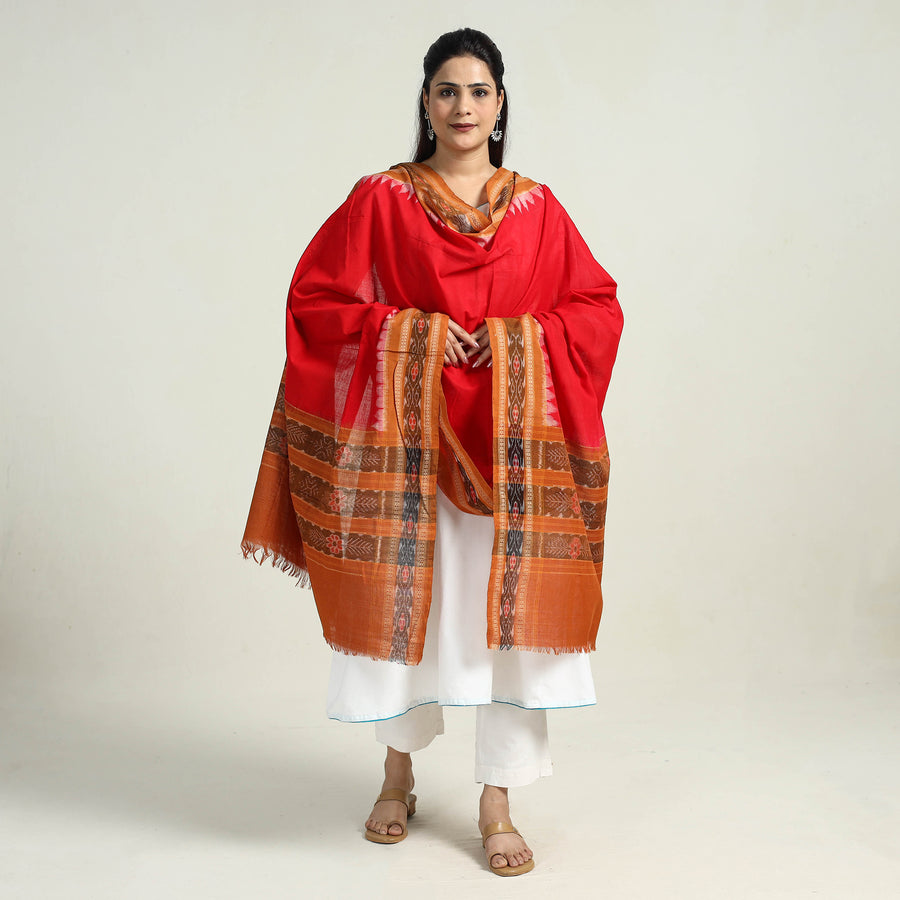 Red sambalpuri ikat weave handloom plain cotton dupatta from Odisha. Handcrafted by master artisans, this dupatta showcases the artistry of eastern India. Ikat, a dyeing technique known for its stunning patterns and vibrant colors, adds a touch of elegance to this piece. Embrace the beauty of Indian ikat, cherished by fashion designers worldwide.