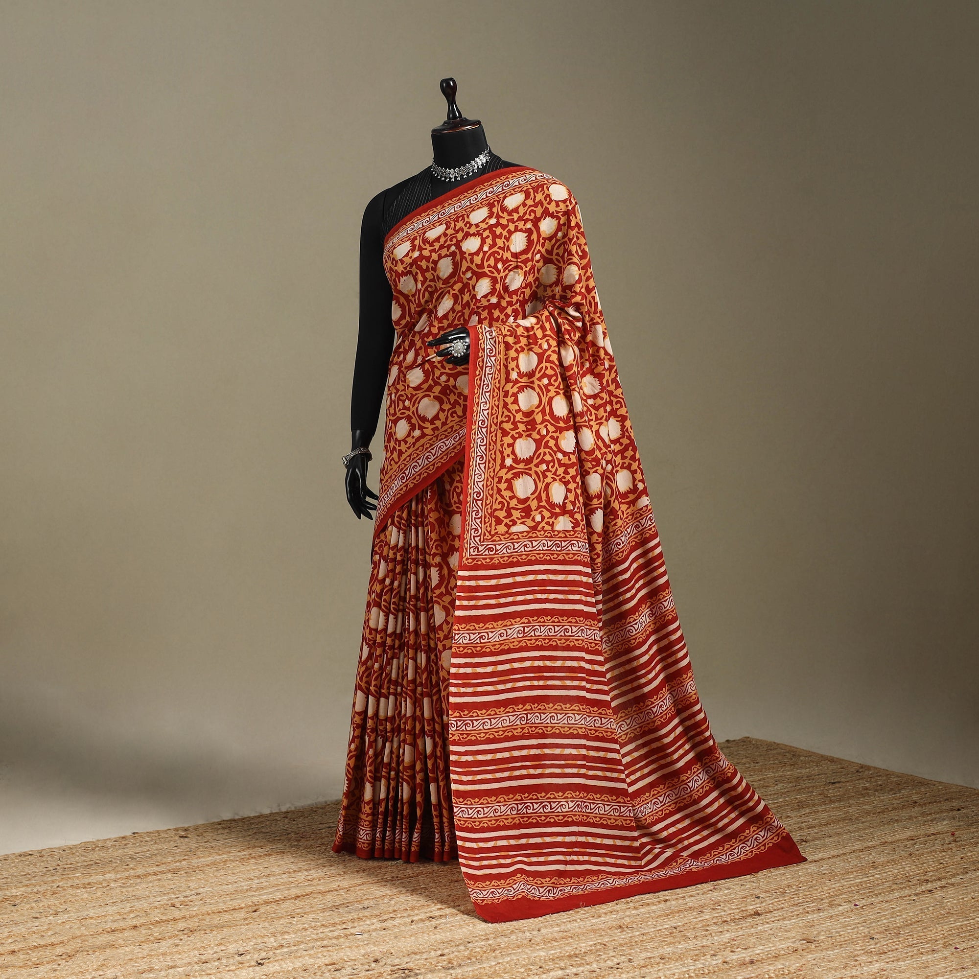 | Material | Indulge in the rich artistry of rajasthan with this red bagru hand block printed mul cotton saree. Known for its fine quality, this saree is adorned with intricate designs inspired by the traditional hand block printing technique originating from Bagru, Rajasthan. Experience the elegance and charm of Indian craftsmanship with this stunning piece. |