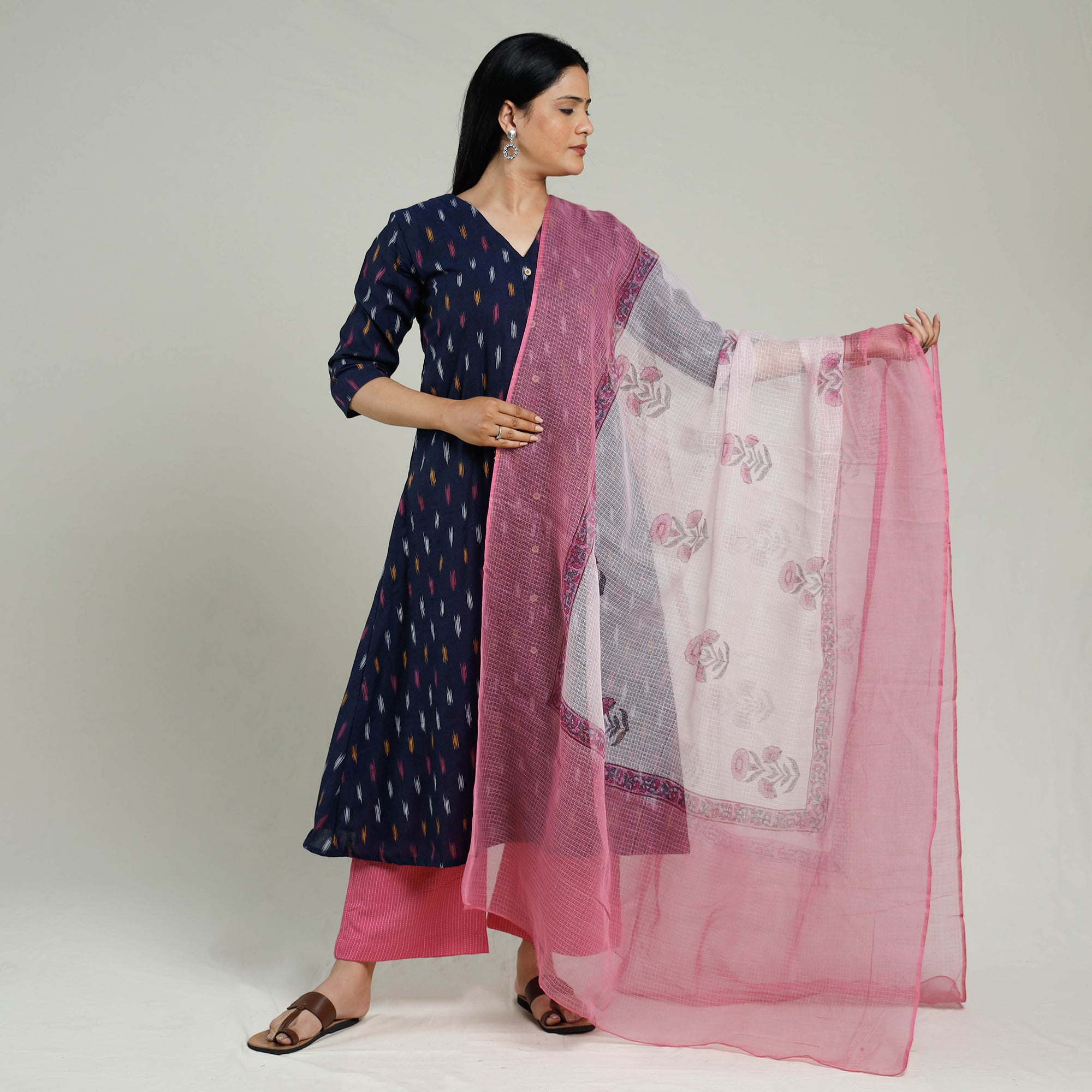 Elevate your style with this exquisite pochampally ikat cotton suit set. Featuring a uniquely designed long kurta with side pockets, palazzo, and sanganeri kota doria dupatta, this set offers comfort and elegance all day long. Whether for daily wear or a special occasion, this suit is a perfect choice for those who appreciate fine craftsmanship and beautiful textiles. Look and feel beautiful in this stunning ensemble.