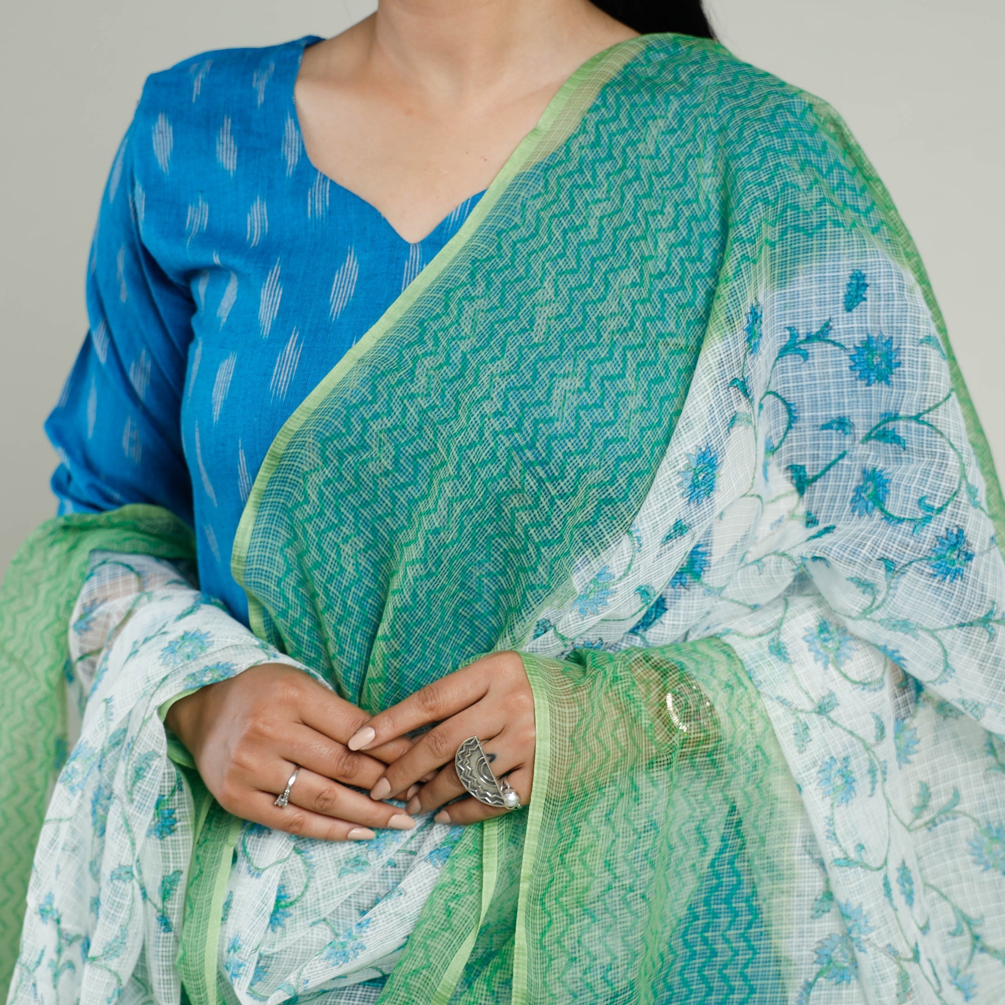 Elevate your style with this exquisite pochampally ikat cotton suit set. Featuring a uniquely designed long kurta with side pockets, palazzo, and sanganeri kota doria dupatta, this set offers comfort and elegance all day long. Whether for daily wear or a special occasion, this suit is a perfect choice for those who appreciate fine craftsmanship and beautiful textiles. Look and feel beautiful in this stunning ensemble.