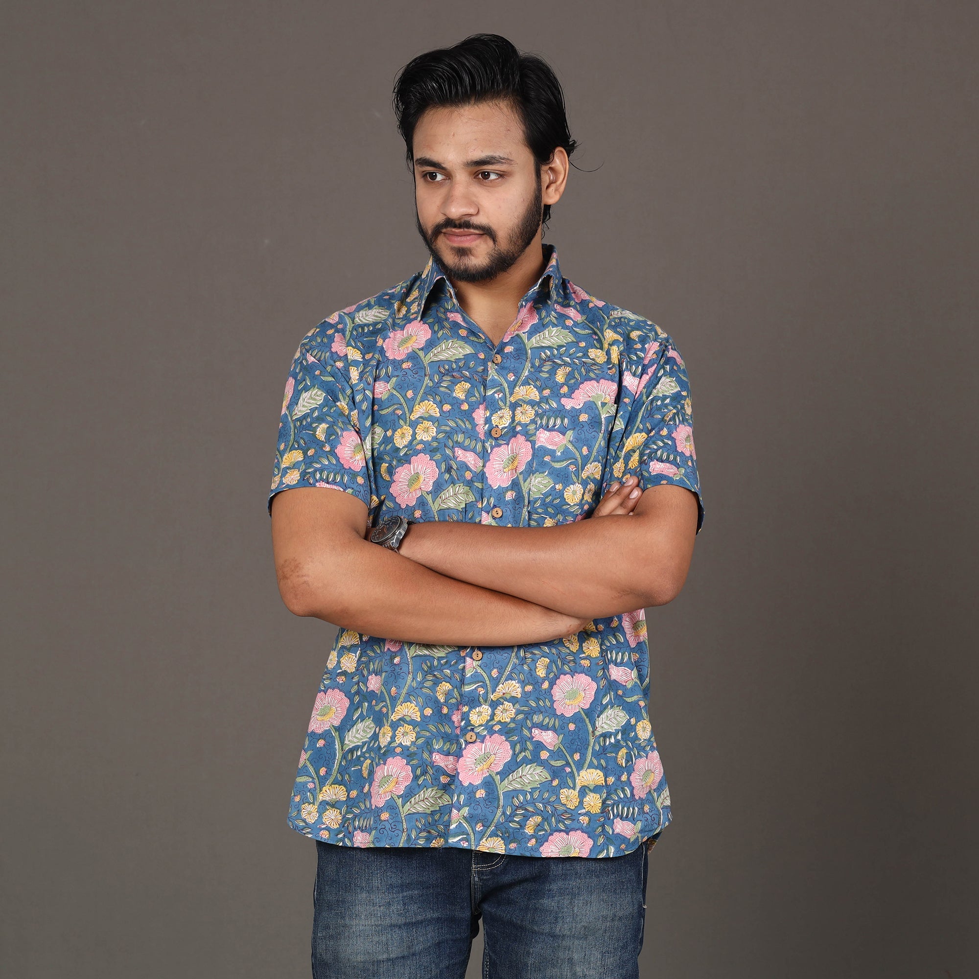 Fine quality sanganeri block printed cotton men half sleeve shirt. This shirt features a regular collar, half sleeves, crisp wooden buttons, and a patch pocket on the front. It is the perfect addition to your casual wardrobe. Sanganeri is a hand-block printing technique originating from Sanganer, a village in the southern part of Jaipur, Rajasthan.