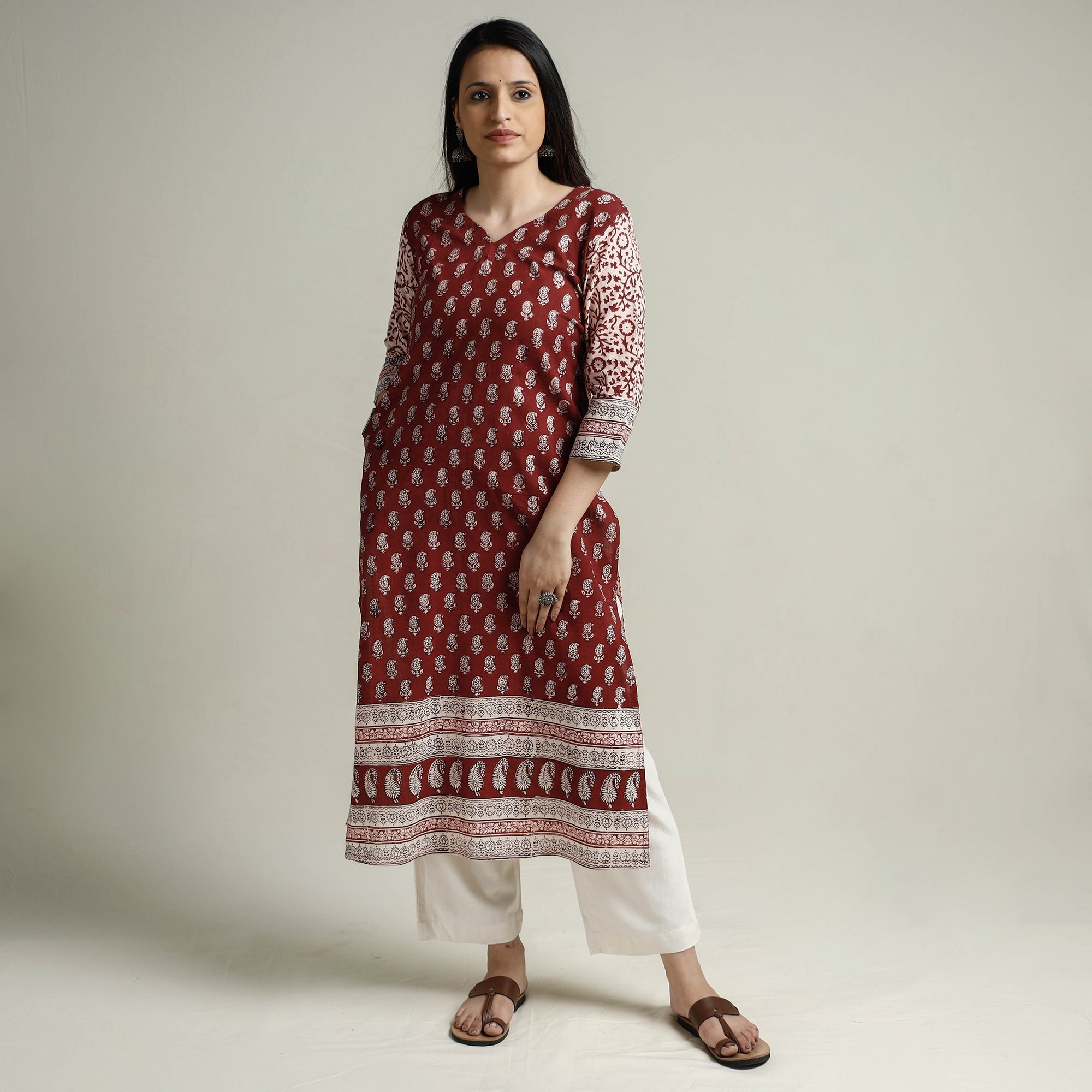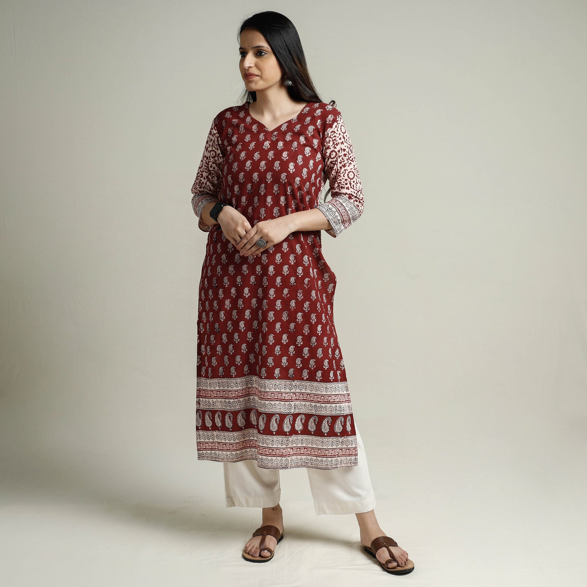 Look and feel beautiful in this uniquely designed maroon block print cotton straight bagh kurta with one side pocket. This cotton kurta makes you comfortable with ease all day long. This kurta is perfect for your daily outing and for a special occasion. Bagh is a hand block printing technique from the Bagh, a small tribal town in Dhar district of Madhya Pradesh. ‘Bagh prints’ are trendy, cool and comfortable cloth material.