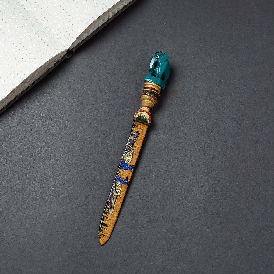 Exquisite rajasthani handpainted paper cutter, meticulously crafted using natural kadam wood and adorned with vibrant acrylic colors. Each piece is lovingly handpainted by master artisans, showcasing the intricate rajasthani designs and cultural motifs. The sturdy kadam wood construction ensures durability, while the sharp blade allows for precise paper cutting. Elevate your desk accessories with this unique and culturally rich paper cutter, a perfect combination of functionality and artistic beauty.