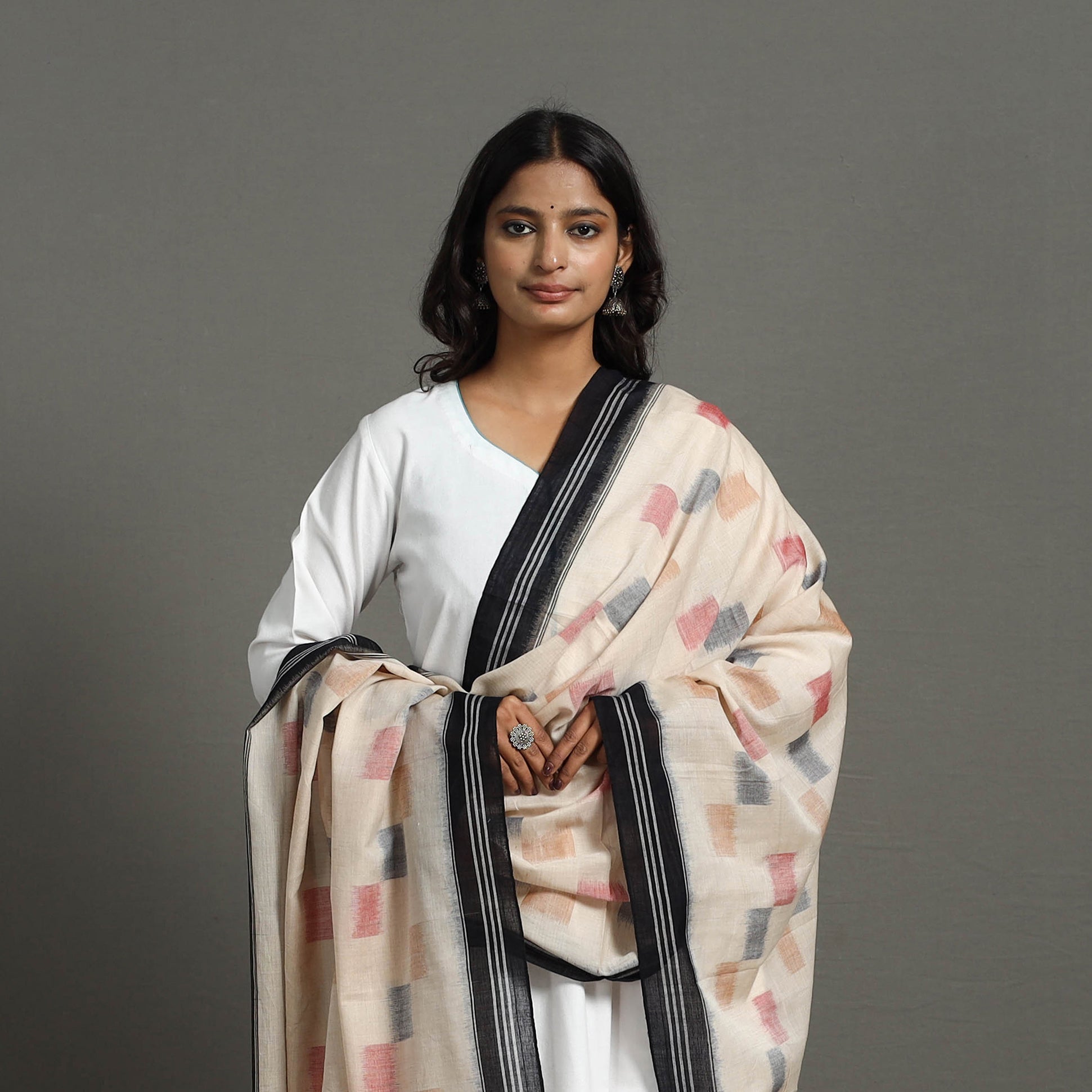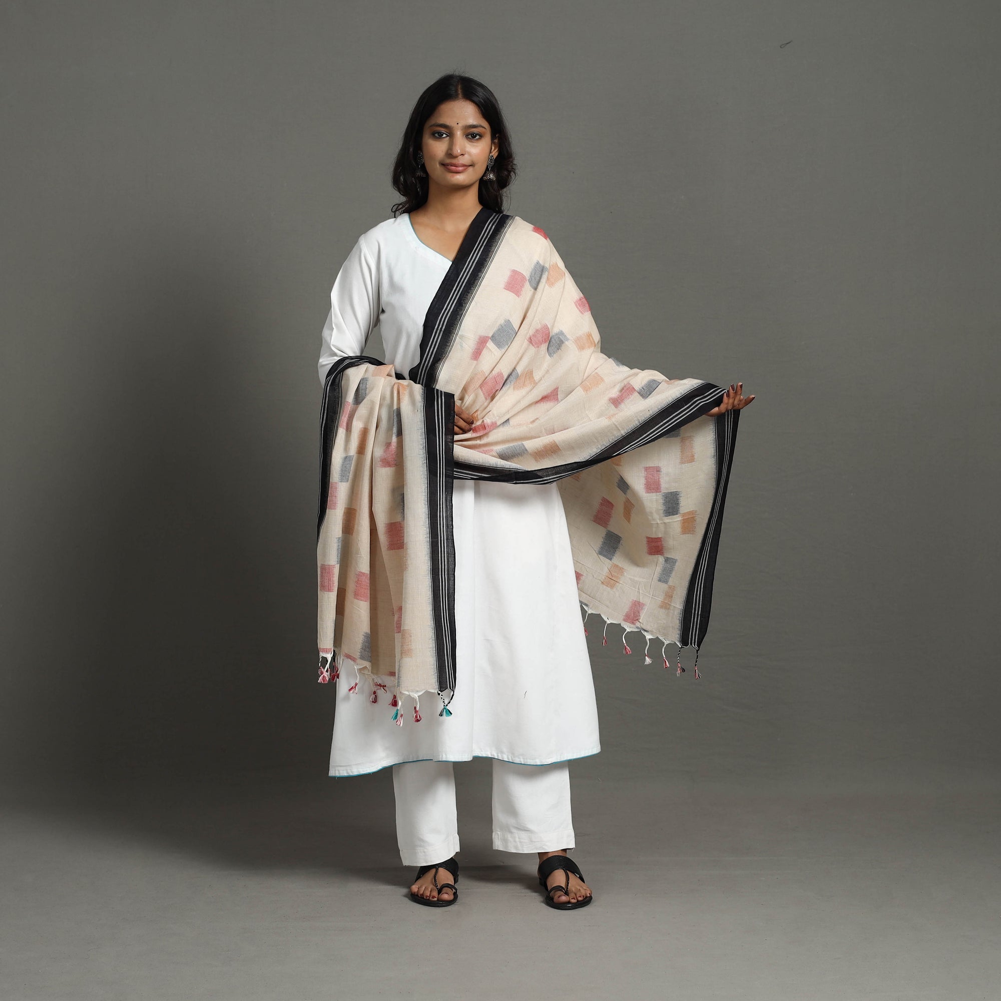 Celebrate the artistry of Odisha with this beige handloom cotton maniabandha ikat dupatta with tassels. Woven using the intricate resist-dye technique it features vibrant patterns and tassel details. Crafted on traditional looms by skilled artisans this dupatta is lightweight breathable and perfect for all occasions. Its cultural heritage and sustainable craftsmanship make it a must have for your collection.