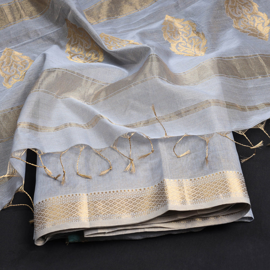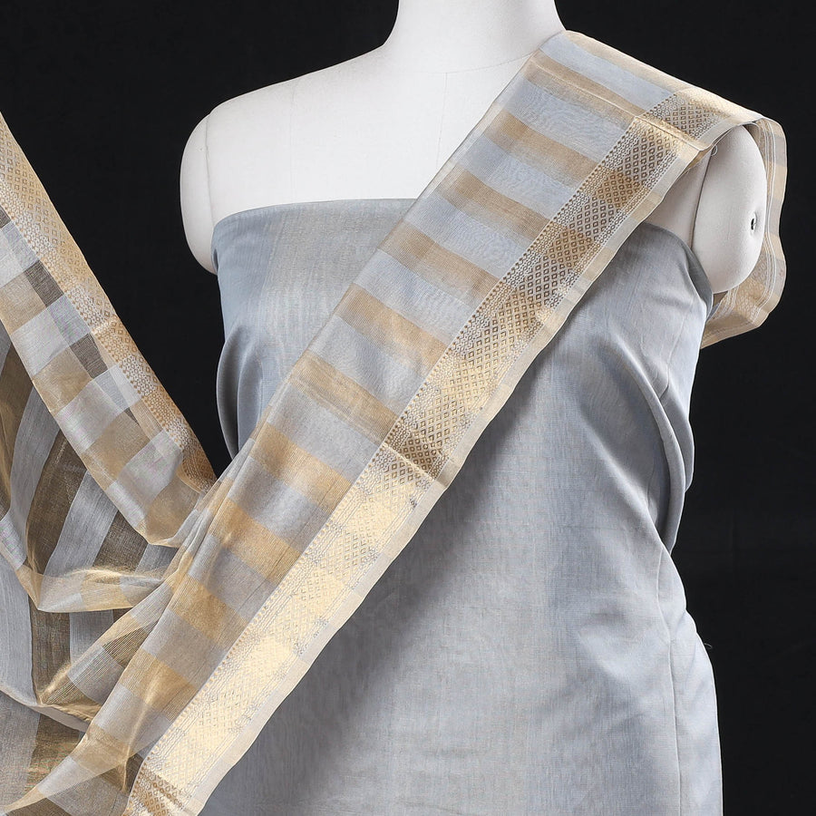 Fine quality maheshwari silk-cotton tissue zari handloom suit material set is a masterpiece of traditional weaving techniques passed down through generations of skilled artisans in Maheshwar. Every thread is carefully woven on a handloom, showcasing the craftsmanship and attention to detail that goes into making each piece. The sheer texture of this suit material enhances its grace and elegance, making it a truly exquisite ensemble.