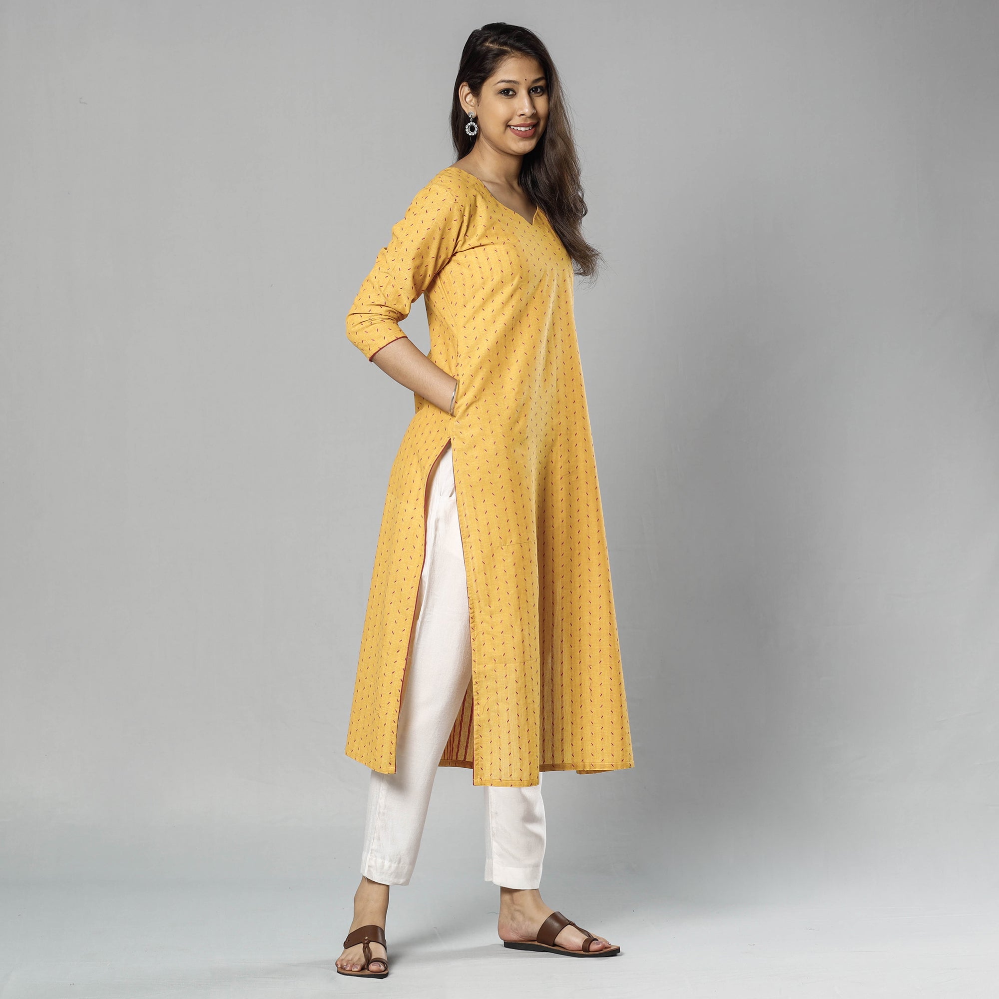 Yellow - A-Line Cotton Hand Embroidered Jacquard Kurta for women 20
