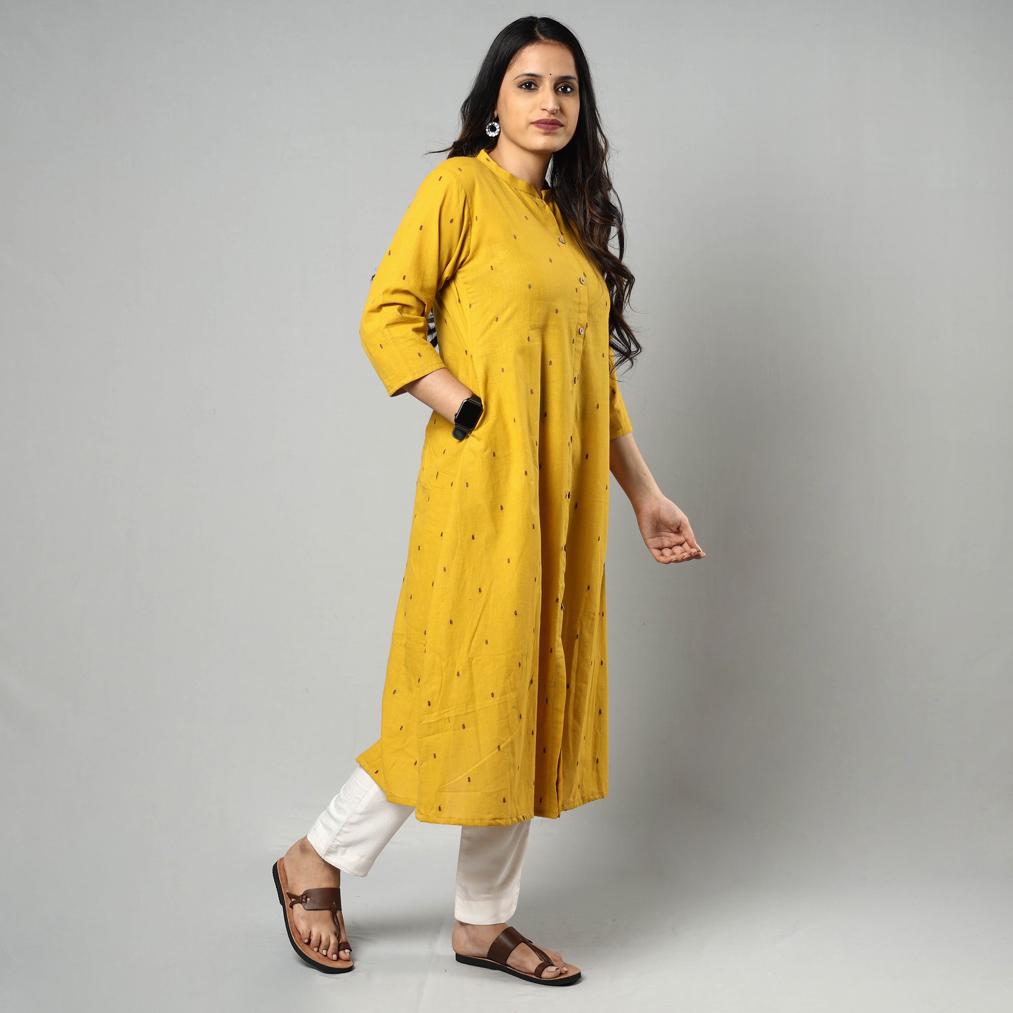 Yellow - A-Line Cotton Hand Embroidered Jacquard Kurta for women 20
