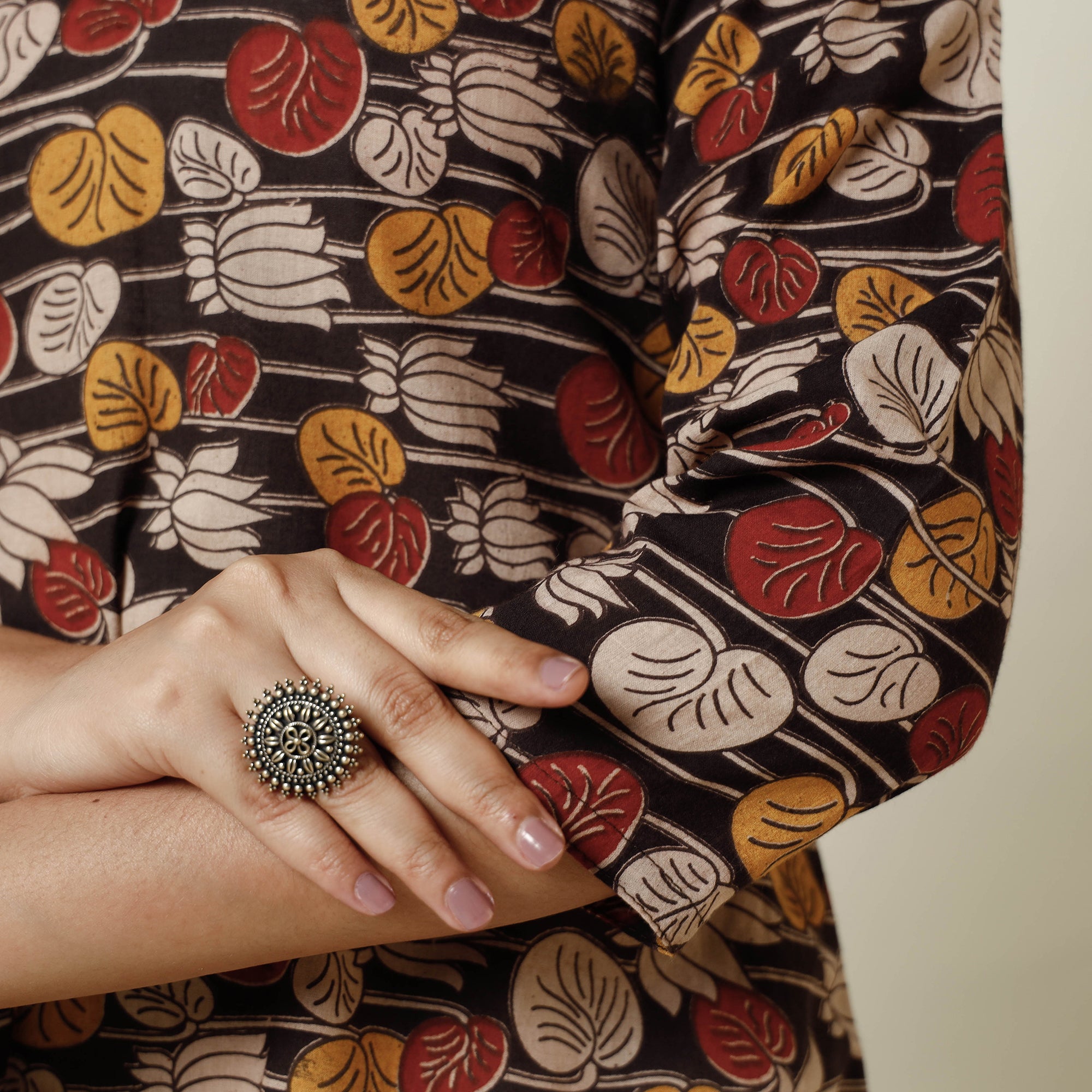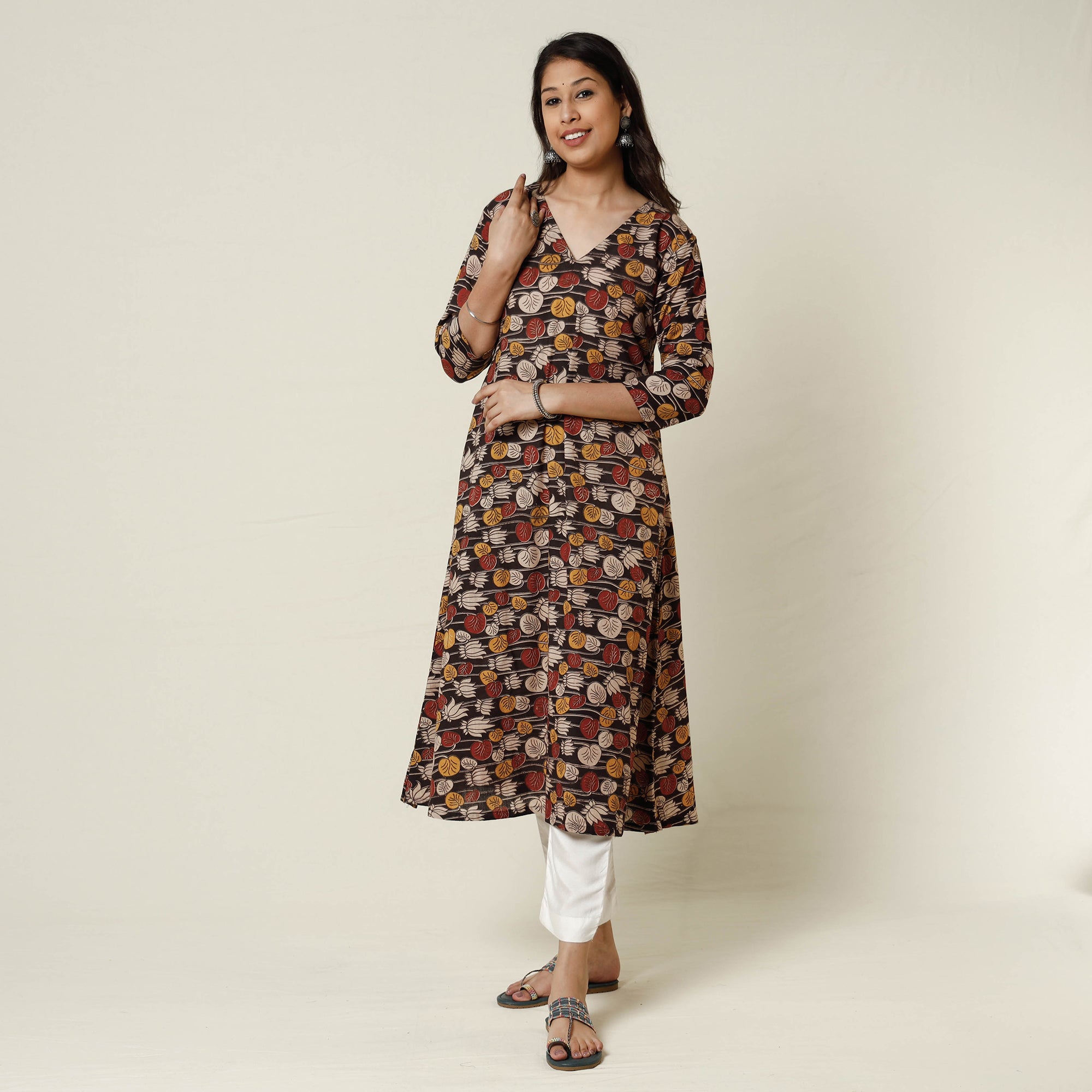 This elegant screen printed cotton long kalamkari kurta is a perfect blend of traditional and contemporary styles. Made from high-quality cotton fabric, it features exquisite Kalamkari screen prints that showcase intricate designs. The long length adds a graceful touch, while the side pocket adds functionality. With its comfortable fit and unique detailing, this kurti is perfect for your daily outing and for a special occasion.
