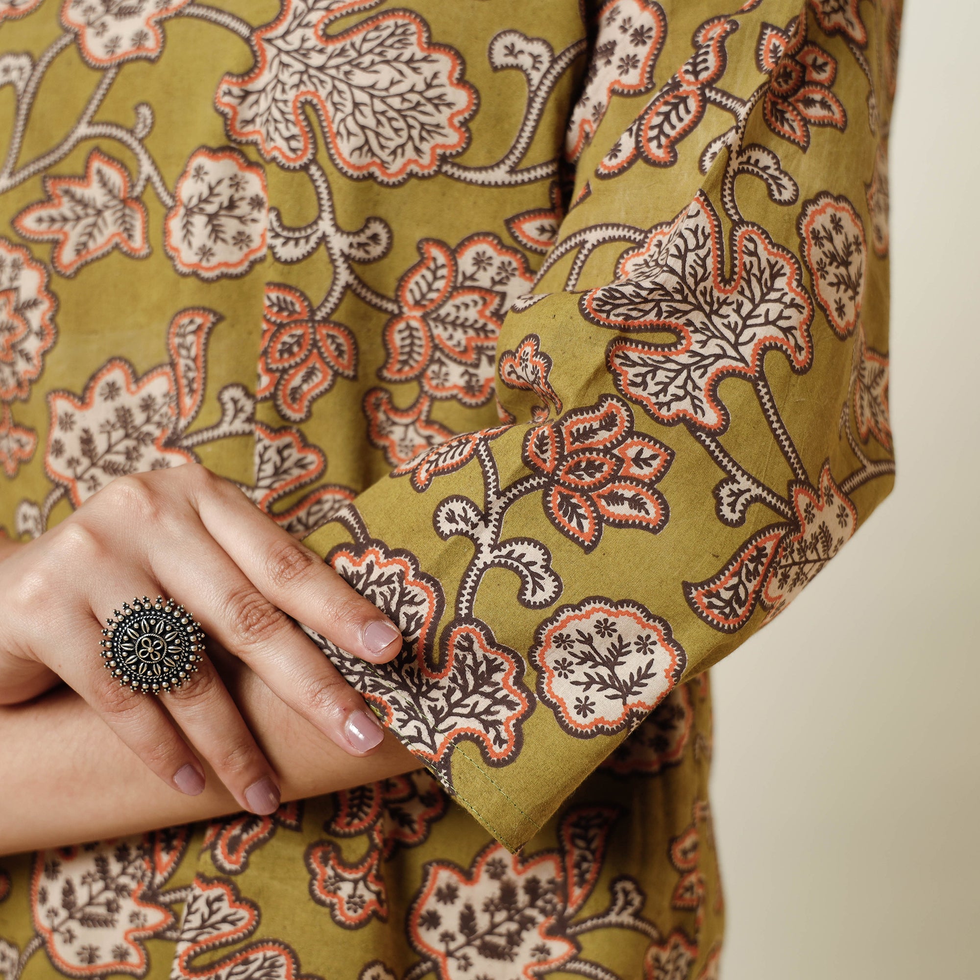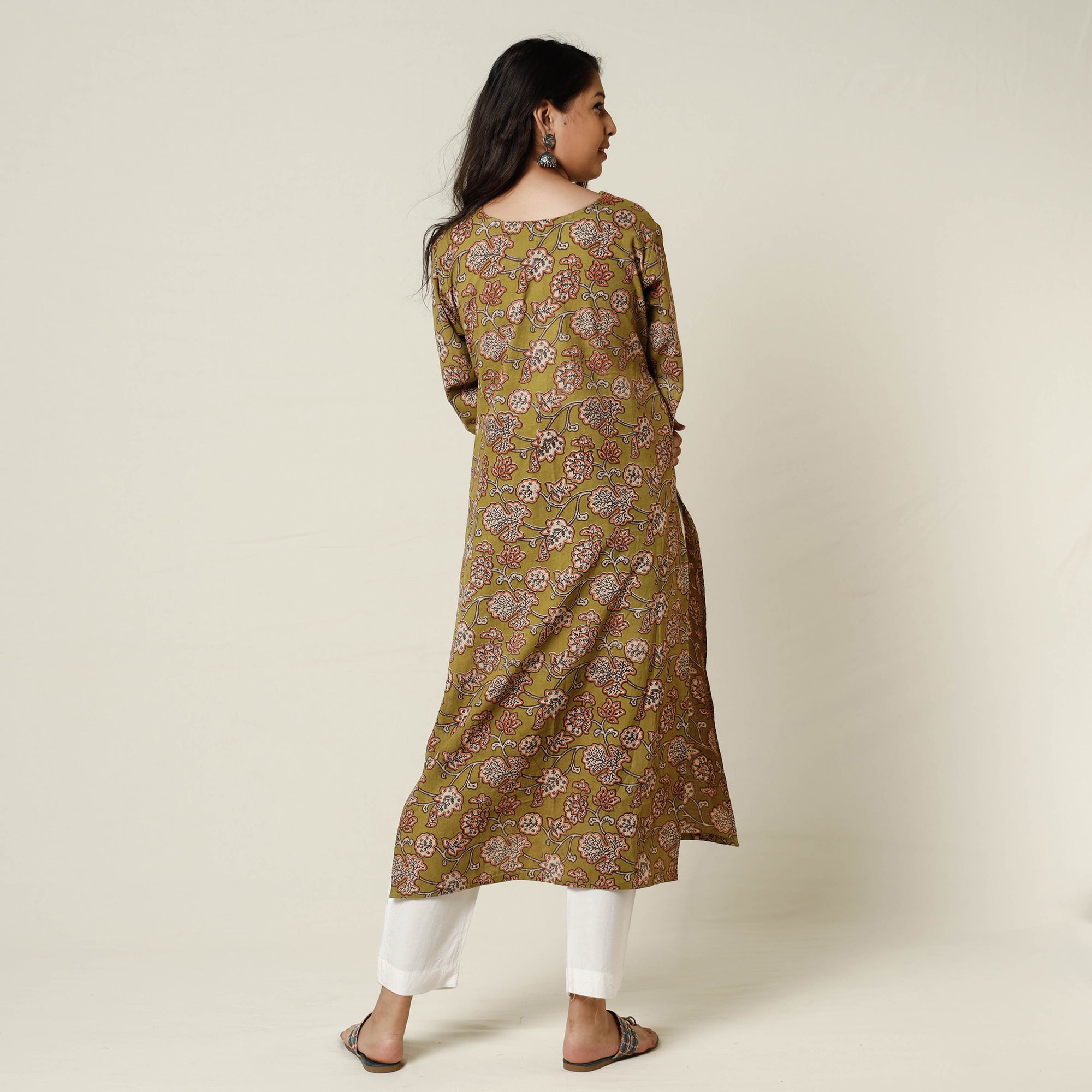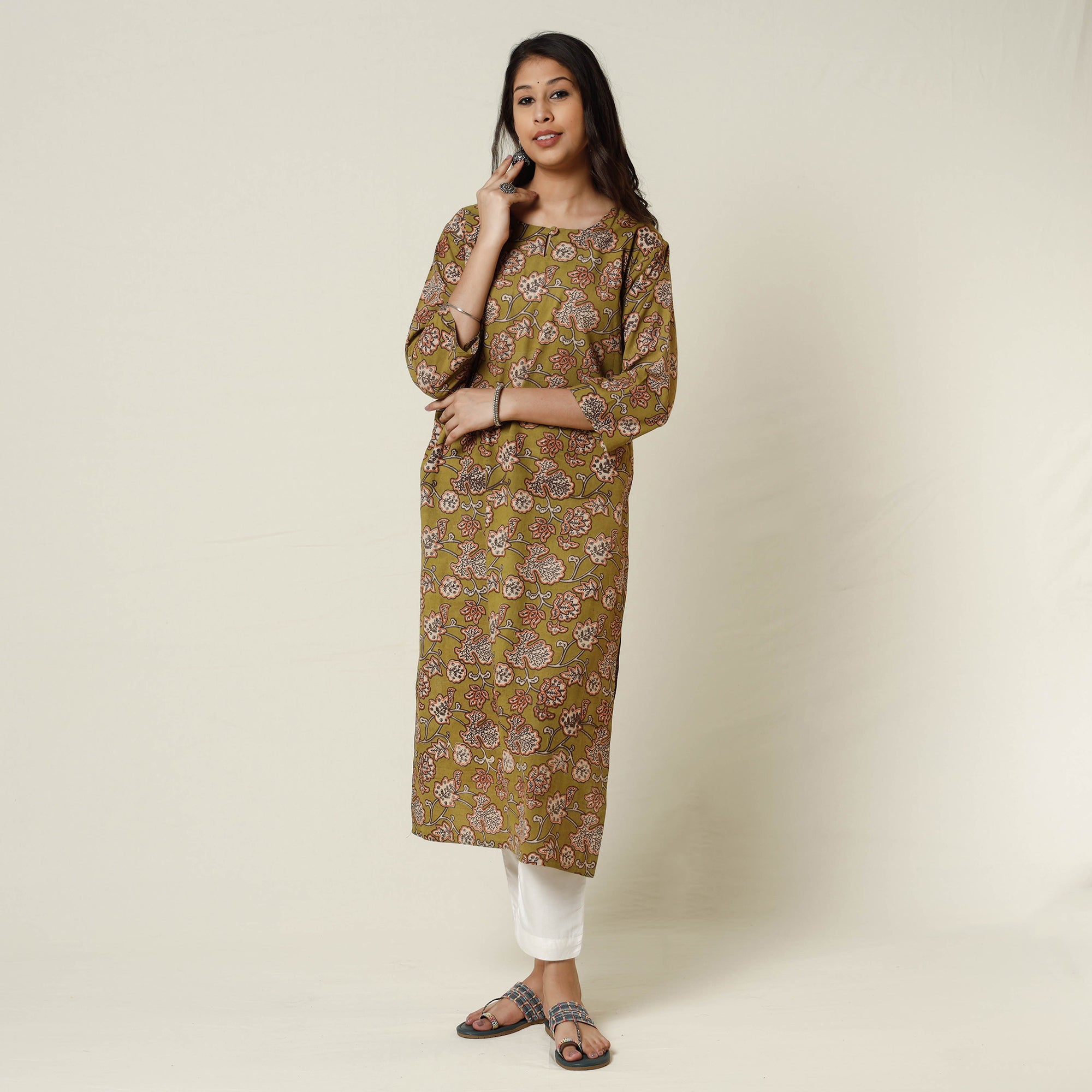 This elegant screen printed cotton long kalamkari kurta is a perfect blend of traditional and contemporary styles. Made from high-quality cotton fabric, it features exquisite Kalamkari screen prints that showcase intricate designs. The long length adds a graceful touch, while the side pocket adds functionality. With its comfortable fit and unique detailing, this kurta is perfect for your daily outing and for a special occasion.