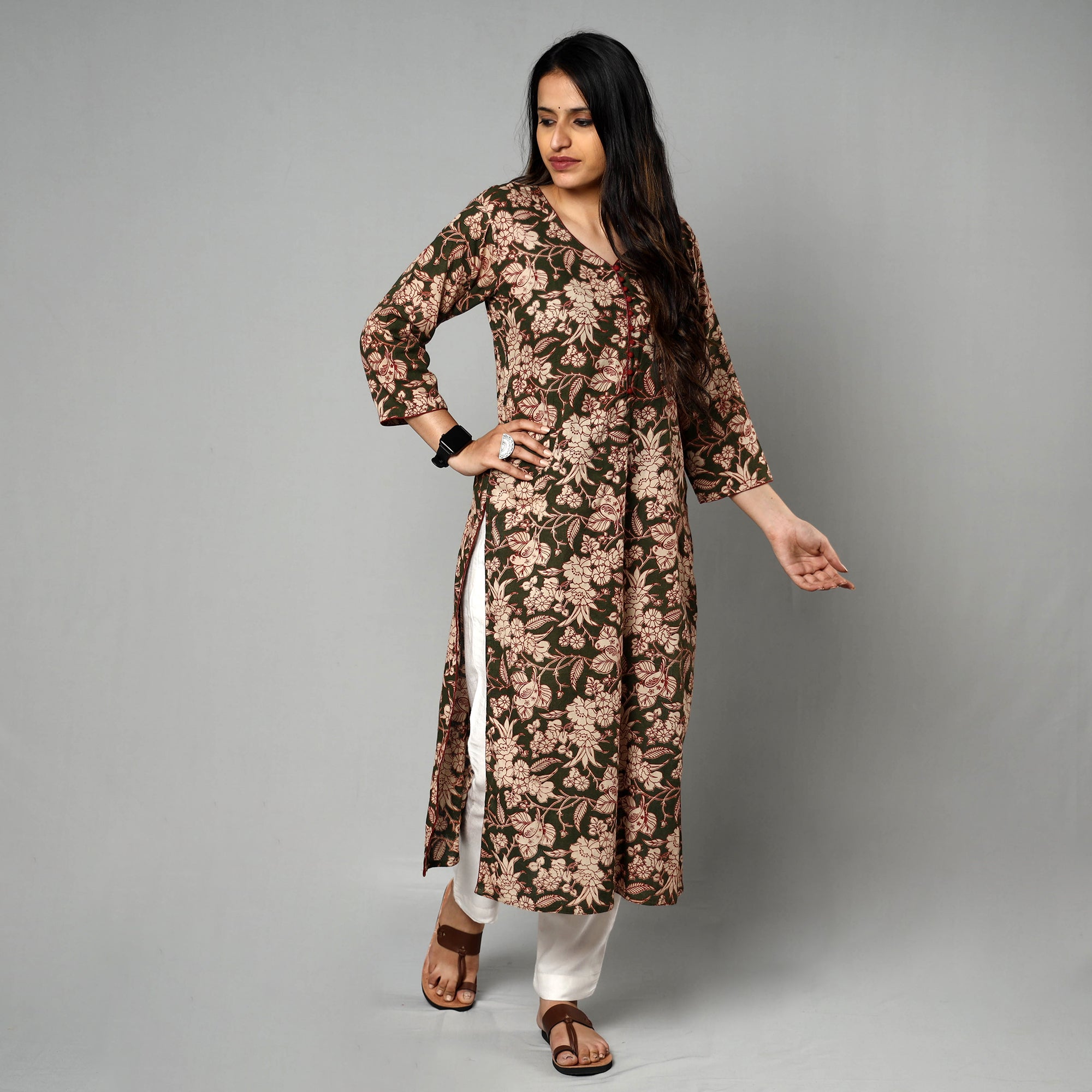 This elegant screen printed cotton long kalamkari kurta is a perfect blend of traditional and contemporary styles. Made from high-quality cotton fabric, it features exquisite Kalamkari screen prints that showcase intricate designs. The long length adds a graceful touch, while the side pocket adds functionality. With its comfortable fit and unique detailing, this Kurta is perfect for your daily outing and for a special occasion.