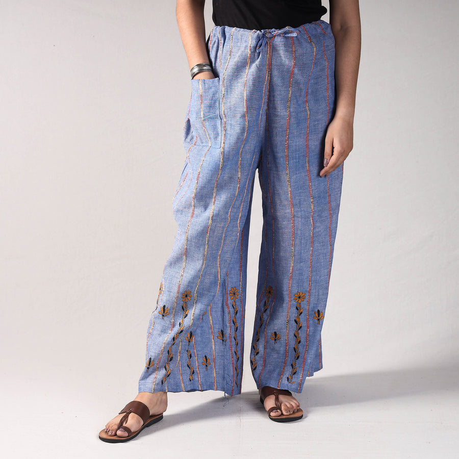 {"id":7597193429187,"title":"Blue - Bengal Khesh Weaving Kantha Embroidery Cotton Palazzo","handle":"2023-238-1-10-bengal-khesh-weaving-kantha-embroidery-cotton-palazzo","description":"\u003ctable width=\"100%\" class=\"gmail-mce-item-table\"\u003e\n\u003ctbody\u003e\n\u003ctr\u003e\n\u003ctd\u003e\u003cspan style=\"color: #f1c232;\"\u003eSize\u003c\/span\u003e\u003c\/td\u003e\n\u003ctd\u003e\n\u003cspan data-mce-fragment=\"1\"\u003eLength - 102 cm, (Adjustable elasticated waistband)\u003c\/span\u003e\u003cspan\u003e. Free Size\u003c\/span\u003e\n\u003c\/td\u003e\n\u003c\/tr\u003e\n\u003ctr\u003e\n\u003ctd\u003e\u003cspan style=\"color: #f1c232;\"\u003eWeight\u003c\/span\u003e\u003c\/td\u003e\n\u003ctd\u003e220 grams (approximately). \u003c\/td\u003e\n\u003c\/tr\u003e\n\u003ctr\u003e\n\u003ctd\u003e\u003cspan style=\"color: #f1c232;\"\u003eMaterial\u003c\/span\u003e\u003c\/td\u003e\n\u003ctd\u003eKhesh is a weaving practice carried out as tradition in Rural West Bengal since years. \u003cbr\u003eIt is a beautiful process of making sustainable textiles which essentially involves tearing old sarees into thin strips - the warp has the new thread and the weft uses the thin strips of sarees. The weavers collect cotton sarees and it is the women who patiently tear the sari into multiple long strips. It is up to the weaver to match the warp with the weft and create designs. The beauty of a Khesh fabric is that the colour of the recycled weft fabric keeps changing, sometimes even within a single meter of fabric and that precisely is the uniqueness of this fabric. These handloom cotton fabrics are hand woven and the asymmetry\/ irregularities and slubs in the weaves makes them exclusive.\u003cbr\u003eKhesh fabrics are designed in various ways as well. Beautiful Kantha stitch is being done to give the fabric an exclusive look.\u003c\/td\u003e\n\u003c\/tr\u003e\n\u003ctr\u003e\n\u003ctd\u003e\u003cspan style=\"color: #f1c232;\"\u003eCare\u003c\/span\u003e\u003c\/td\u003e\n\u003ctd\u003eGentle hand wash separately in cold water with mild\/liquid detergents. Avoid soaking for too long.\u003c\/td\u003e\n\u003c\/tr\u003e\n\u003ctr\u003e\n\u003ctd\u003e\u003cspan style=\"color: #f1c232;\"\u003eColour\u003c\/span\u003e\u003c\/td\u003e\n\u003ctd\u003eSlight difference in color from the visible product image is possible. \u003ca href=\"http:\/\/www.itokri.com\/pages\/photos\" target=\"_blank\"\u003eRead more\u003c\/a\u003e.\u003c\/td\u003e\n\u003c\/tr\u003e\n\u003c\/tbody\u003e\n\u003c\/table\u003e","published_at":"2023-06-16T15:31:39+05:30","created_at":"2023-06-16T14:39:58+05:30","vendor":"ASALKAAR","type":"bottoms","tags":["asalkaar","blue","bottoms","material-cotton","meta-filter-craft process-bengal kantha work","palazzo\/pants","primarycraft_bengal-kantha-work"],"price":189000,"price_min":189000,"price_max":189000,"available":true,"price_varies":false,"compare_at_price":null,"compare_at_price_min":0,"compare_at_price_max":0,"compare_at_price_varies":false,"variants":[{"id":42461197631683,"title":"Default Title","option1":"Default Title","option2":null,"option3":null,"sku":"ZLA\/70\/10","requires_shipping":true,"taxable":true,"featured_image":null,"available":true,"name":"Blue - Bengal Khesh Weaving Kantha Embroidery Cotton Palazzo","public_title":null,"options":["Default Title"],"price":189000,"weight":500,"compare_at_price":null,"inventory_quantity":1,"inventory_management":"shopify","inventory_policy":"deny","barcode":"","requires_selling_plan":false,"selling_plan_allocations":[],"quantity_rule":{"min":1,"max":null,"increment":1}}],"images":["\/\/itokri.com\/cdn\/shop\/files\/0Q8A3151_58370287-dddd-45d4-a695-9caf0ac8fa08.jpg?v=1686908966","\/\/itokri.com\/cdn\/shop\/files\/0Q8A3152_13563d84-e8d0-46a6-bcac-0858fc18eae7.jpg?v=1686908966","\/\/itokri.com\/cdn\/shop\/files\/0Q8A3154_8875366e-b835-402d-af50-92a930a09e0d.jpg?v=1686908966"],"featured_image":"\/\/itokri.com\/cdn\/shop\/files\/0Q8A3151_58370287-dddd-45d4-a695-9caf0ac8fa08.jpg?v=1686908966","options":["Title"],"media":[{"alt":"Buy Bengal Khesh Weaving Kantha Embroidery Cotton Palazzo Online at iTokri.com","id":32925970530499,"position":1,"preview_image":{"aspect_ratio":1.0,"height":2000,"width":2000,"src":"\/\/itokri.com\/cdn\/shop\/files\/0Q8A3151_58370287-dddd-45d4-a695-9caf0ac8fa08.jpg?v=1686908966"},"aspect_ratio":1.0,"height":2000,"media_type":"image","src":"\/\/itokri.com\/cdn\/shop\/files\/0Q8A3151_58370287-dddd-45d4-a695-9caf0ac8fa08.jpg?v=1686908966","width":2000},{"alt":"Buy Bengal Khesh Weaving Kantha Embroidery Cotton Palazzo Online at iTokri.com","id":32925970563267,"position":2,"preview_image":{"aspect_ratio":1.0,"height":2000,"width":2000,"src":"\/\/itokri.com\/cdn\/shop\/files\/0Q8A3152_13563d84-e8d0-46a6-bcac-0858fc18eae7.jpg?v=1686908966"},"aspect_ratio":1.0,"height":2000,"media_type":"image","src":"\/\/itokri.com\/cdn\/shop\/files\/0Q8A3152_13563d84-e8d0-46a6-bcac-0858fc18eae7.jpg?v=1686908966","width":2000},{"alt":"Buy Bengal Khesh Weaving Kantha Embroidery Cotton Palazzo Online at iTokri.com","id":32925970596035,"position":3,"preview_image":{"aspect_ratio":1.0,"height":2000,"width":2000,"src":"\/\/itokri.com\/cdn\/shop\/files\/0Q8A3154_8875366e-b835-402d-af50-92a930a09e0d.jpg?v=1686908966"},"aspect_ratio":1.0,"height":2000,"media_type":"image","src":"\/\/itokri.com\/cdn\/shop\/files\/0Q8A3154_8875366e-b835-402d-af50-92a930a09e0d.jpg?v=1686908966","width":2000}],"requires_selling_plan":false,"selling_plan_groups":[],"content":"\u003ctable width=\"100%\" class=\"gmail-mce-item-table\"\u003e\n\u003ctbody\u003e\n\u003ctr\u003e\n\u003ctd\u003e\u003cspan style=\"color: #f1c232;\"\u003eSize\u003c\/span\u003e\u003c\/td\u003e\n\u003ctd\u003e\n\u003cspan data-mce-fragment=\"1\"\u003eLength - 102 cm, (Adjustable elasticated waistband)\u003c\/span\u003e\u003cspan\u003e. Free Size\u003c\/span\u003e\n\u003c\/td\u003e\n\u003c\/tr\u003e\n\u003ctr\u003e\n\u003ctd\u003e\u003cspan style=\"color: #f1c232;\"\u003eWeight\u003c\/span\u003e\u00