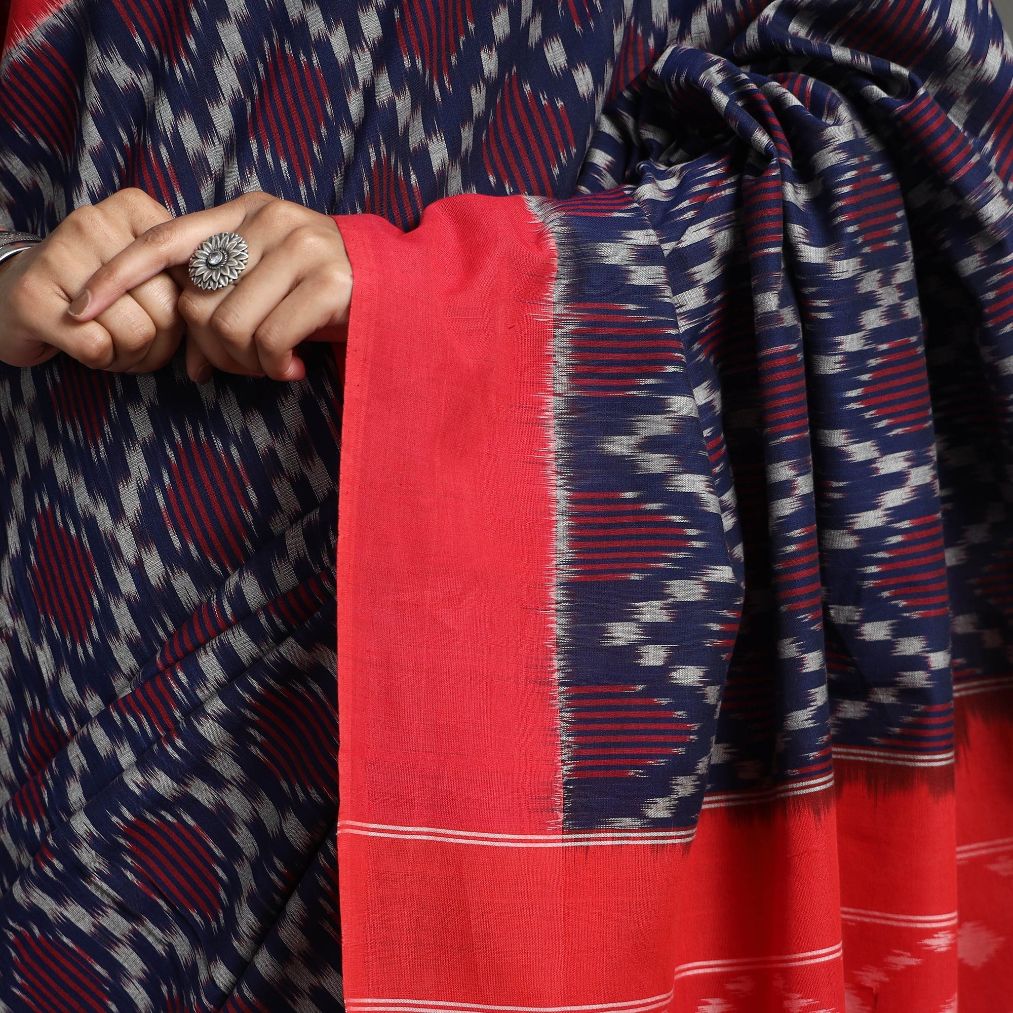 Indulge in the timeless beauty of this blue pochampally ikat handloom cotton saree from Telangana. Adorned with intricate patterns created using the traditional resist dyeing technique, Ikat, this saree showcases the mastery of craftsmanship. Known for its vibrant colors, exquisite textures, and captivating designs, Indian Ikat has long been cherished by fashion designers worldwide. With its rich heritage and exceptional artistry, this saree is a testament to the beauty and elegance of traditional handloom textiles.