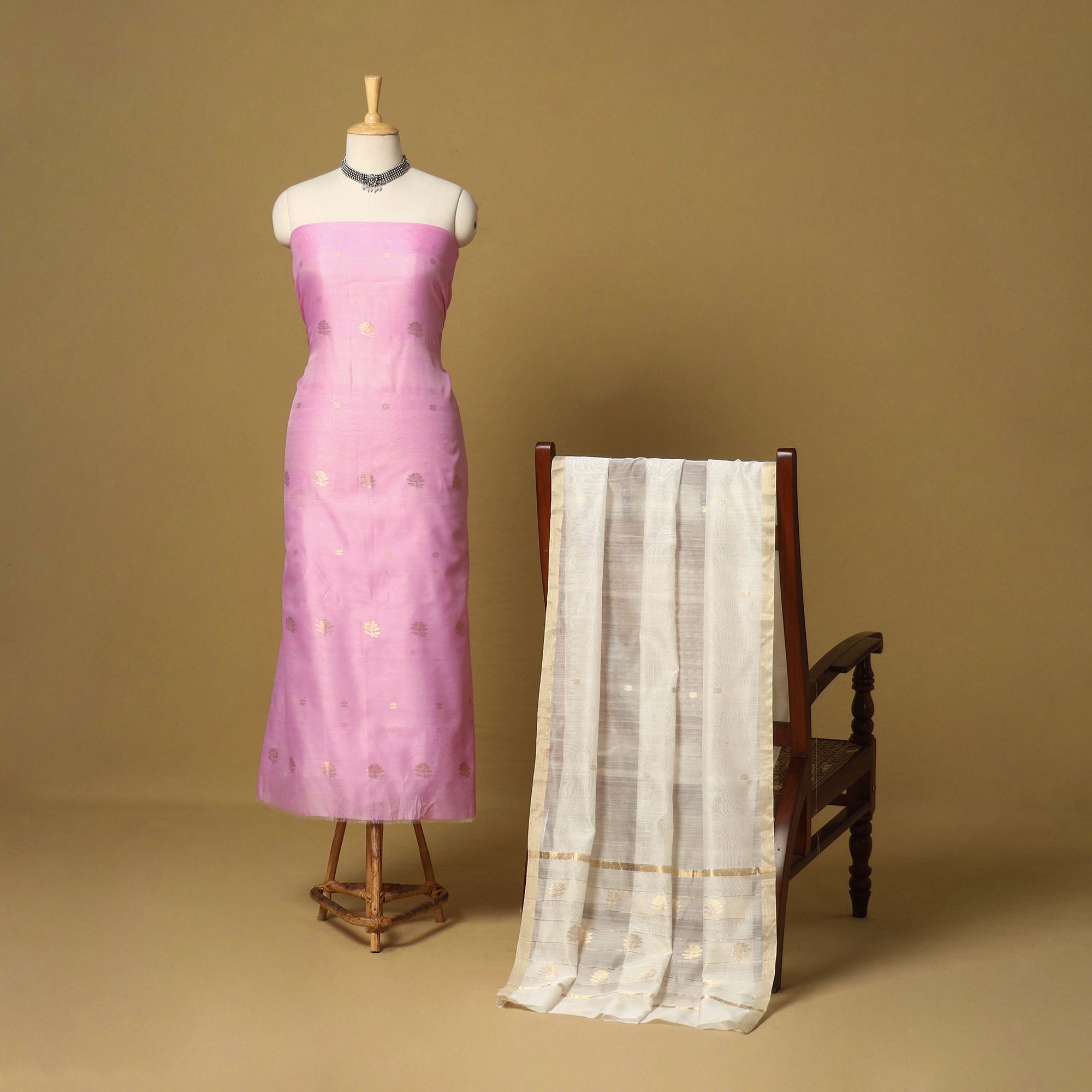 Fine quality pink chanderi silk-cotton handloom 2-piece flower zari buta suit material set with zari border. Chanderi silks are known for their gossamer looks and amazing feel. Chanderi weaving, a traditional art form practised in the historic town of Chanderi in Madhya Pradesh, adds a touch of elegance to this ensemble. The delicate flower zari butas, meticulously handwoven on a traditional handloom, enhance the beauty of the fabric. Skilled artisans employ separate needles to create intricate motifs, giving each piece a unique and enchanting charm.
