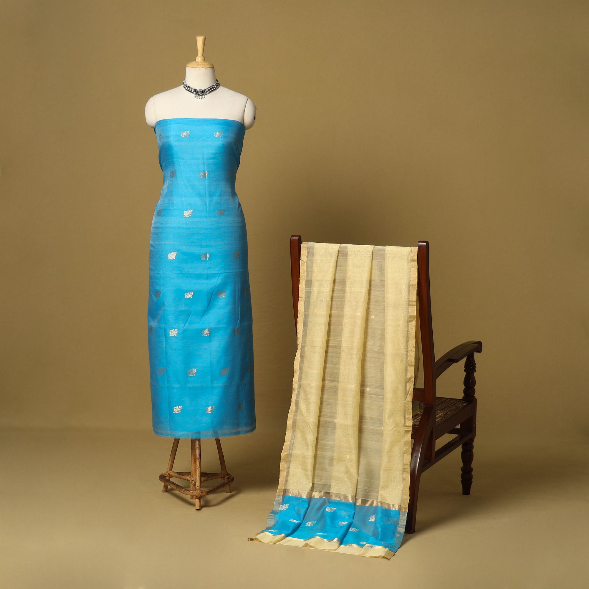 Fine quality blue chanderi silk-cotton handloom 2-piece flower zari buta suit material set with zari border. Chanderi silks are known for their gossamer looks and amazing feel. Chanderi weaving, a traditional art form practised in the historic town of Chanderi in Madhya Pradesh, adds a touch of elegance to this ensemble. The delicate flower zari butas, meticulously handwoven on a traditional handloom, enhance the beauty of the fabric. Skilled artisans employ separate needles to create intricate motifs, giving each piece a unique and enchanting charm.