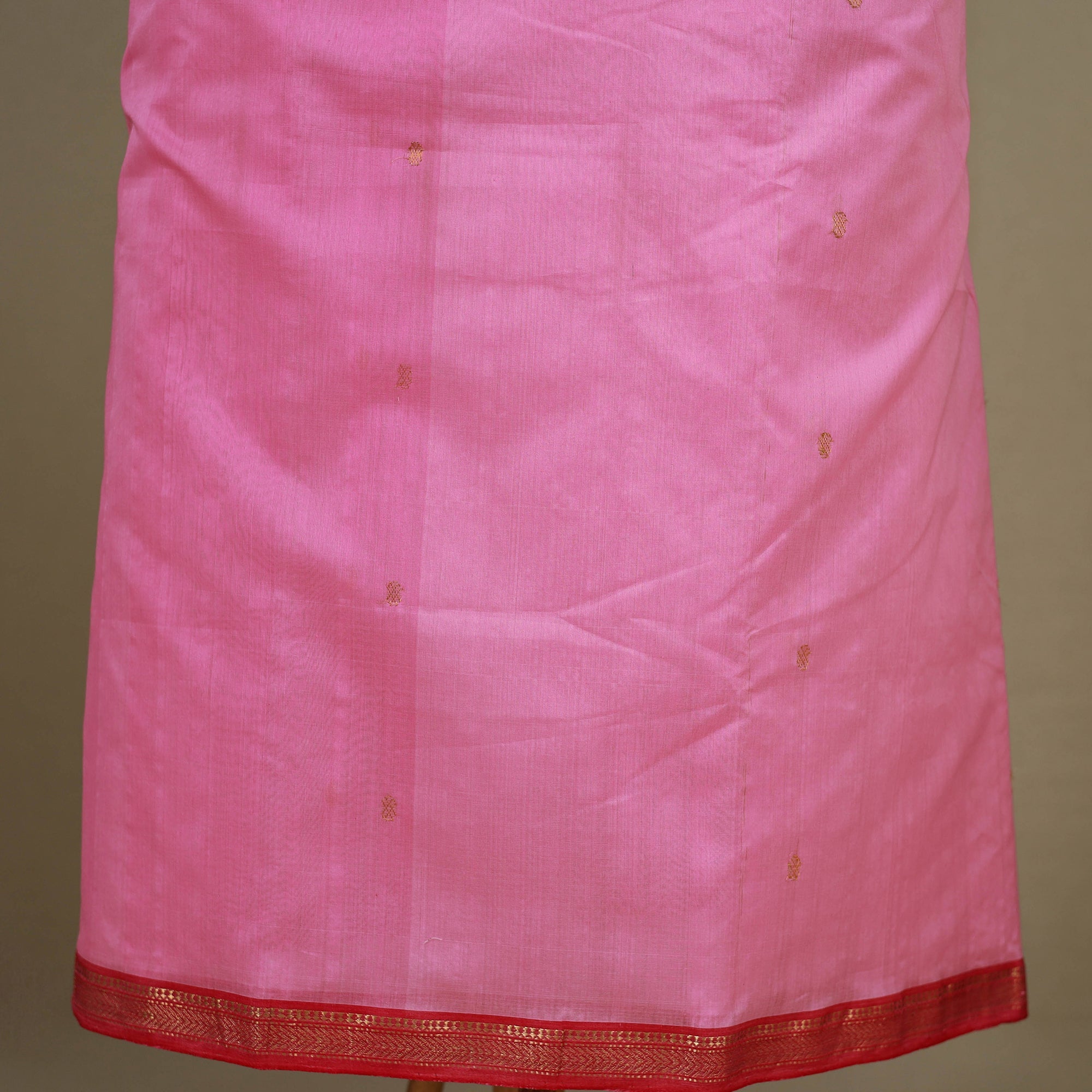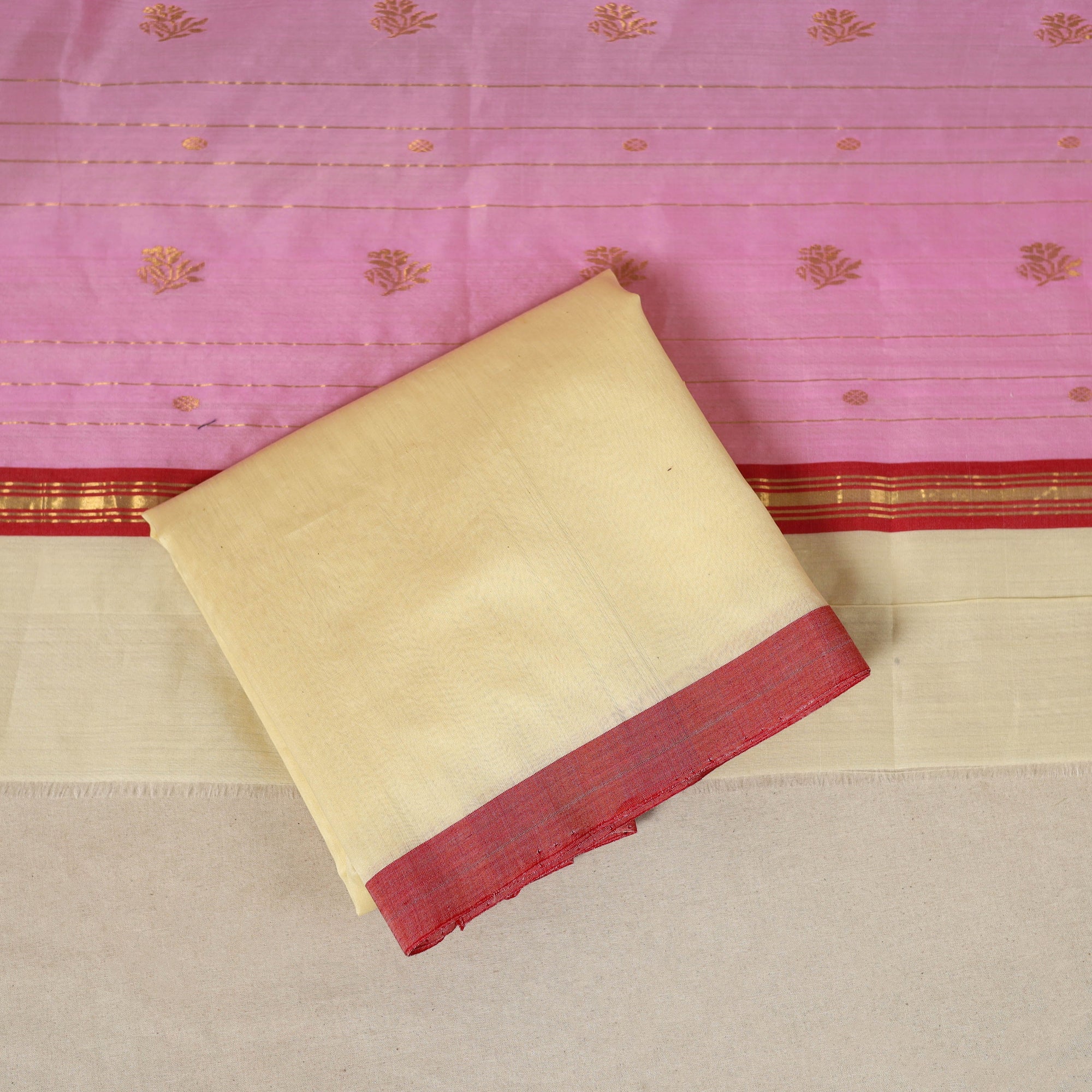 Fine quality pink chanderi silk-cotton handloom 3-piece zari buti suit material set with nakshi zari border. Chanderi silks are known for their gossamer looks and amazing feel. Chanderi weaving, a traditional art form practised in the historic town of Chanderi in Madhya Pradesh, adds a touch of elegance to this ensemble. The delicate zari butis, meticulously handwoven on a traditional handloom, enhance the beauty of the fabric. Skilled artisans employ separate needles to create intricate motifs, giving each piece a unique and enchanting charm.