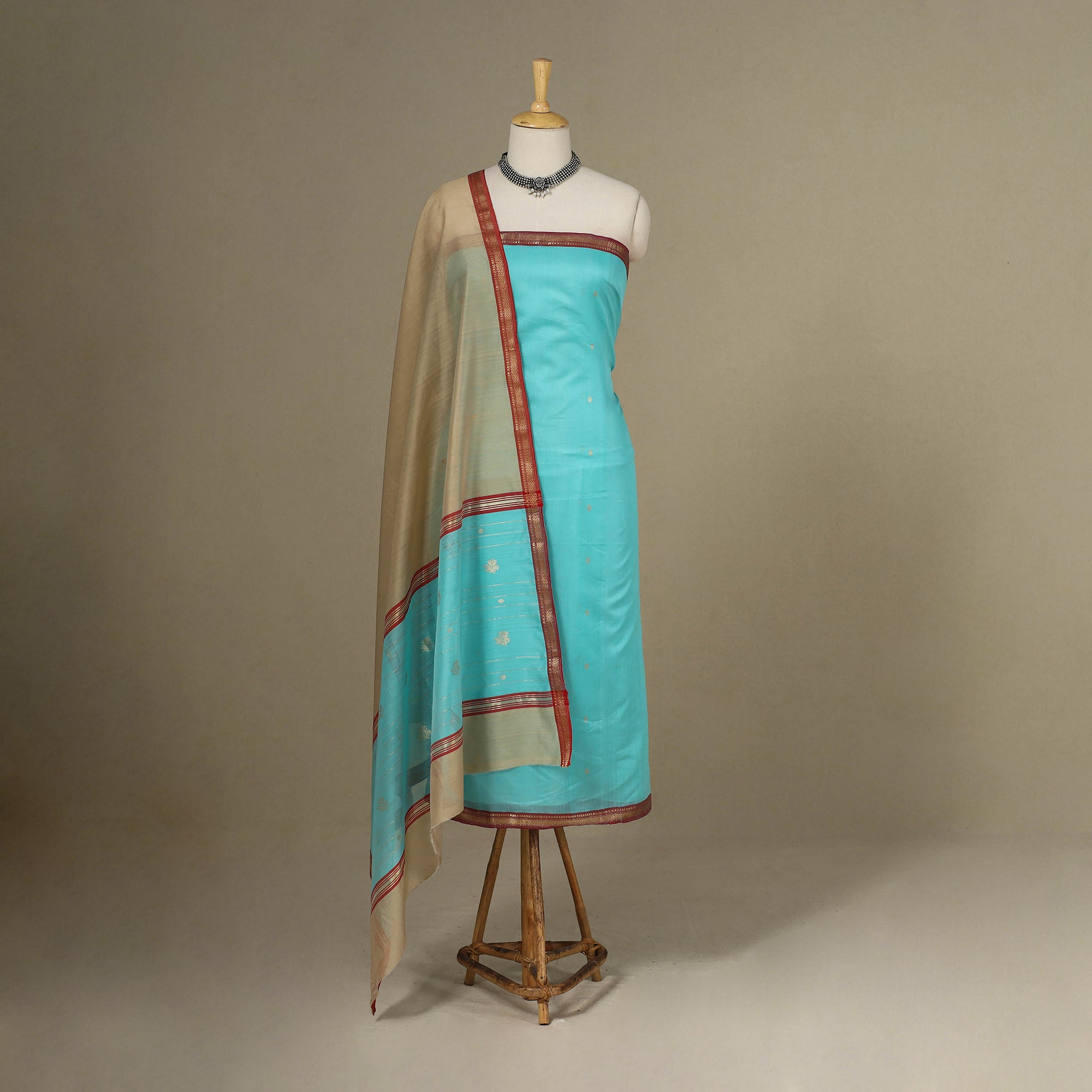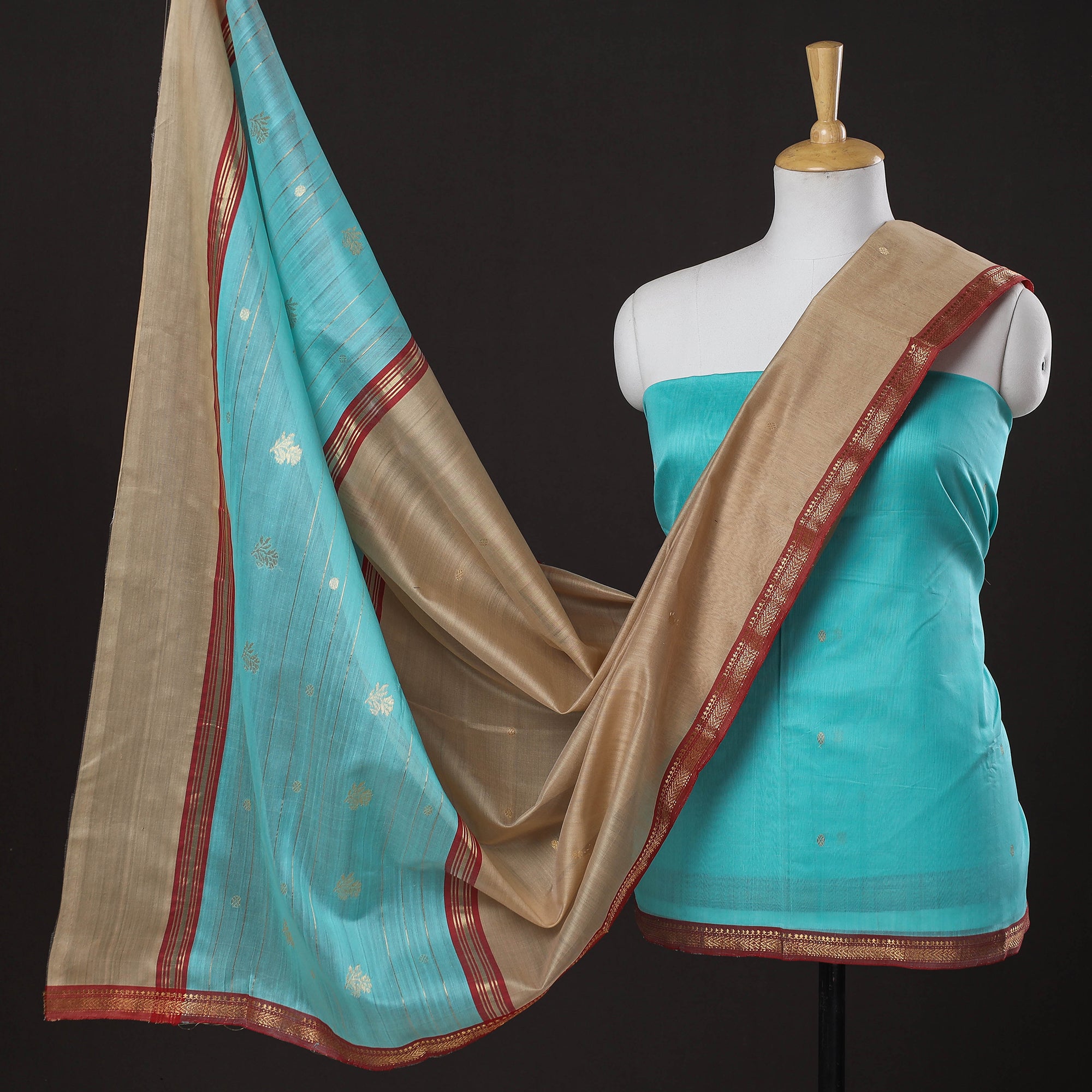 Fine quality blue chanderi silk-cotton handloom 3-piece zari buti suit material set with nakshi zari border. Chanderi silks are known for their gossamer looks and amazing feel. Chanderi weaving, a traditional art form practised in the historic town of Chanderi in Madhya Pradesh, adds a touch of elegance to this ensemble. The delicate zari butis, meticulously handwoven on a traditional handloom, enhance the beauty of the fabric. Skilled artisans employ separate needles to create intricate motifs, giving each piece a unique and enchanting charm.