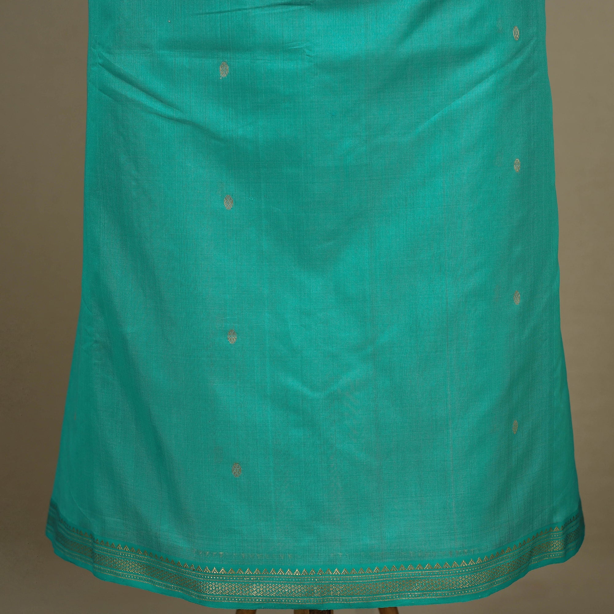 Fine quality green chanderi silk-cotton handloom 3-piece zari buti suit material set with nakshi zari border. Chanderi silks are known for their gossamer looks and amazing feel. Chanderi weaving, a traditional art form practised in the historic town of Chanderi in Madhya Pradesh, adds a touch of elegance to this ensemble. The delicate zari butis, meticulously handwoven on a traditional handloom, enhance the beauty of the fabric. Skilled artisans employ separate needles to create intricate motifs, giving each piece a unique and enchanting charm.