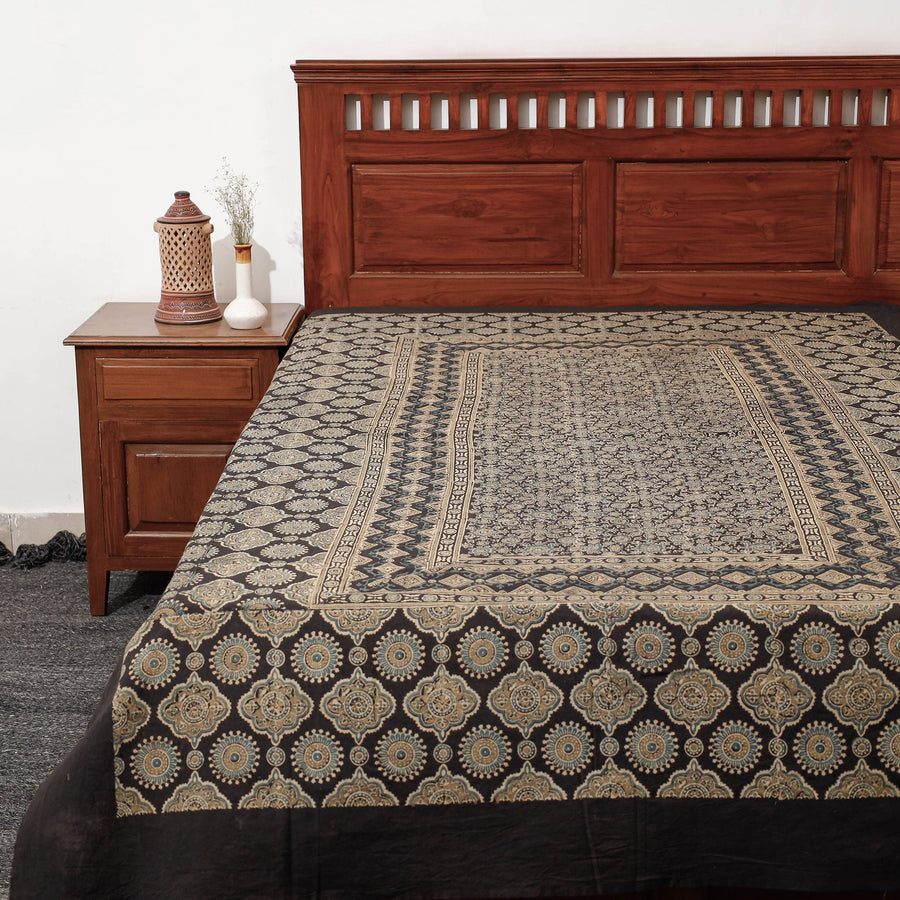 Fine quality brown ajrakh block printed cotton single bed cover made using natural dyes through traditional process of hand block printing practised by the master artisans in Kutch region of Gujarat. Ajrakh is a traditional vegetable dyeing and resist block-printing technique on cloth. It is estimated to be around 4,500 years old. The Ajrakh artisans in India are originally from Sindh and they migrated to Kutch in Gujarat and Barmer in Rajasthan. Ajrakh is the traditional attire of the Maldhari pastoral community of Bhuj. The process of 'Ajrakh' is a long drawn process with many stages and each layer of colour is printed after a gap of time so the cloth has to stay for the day.