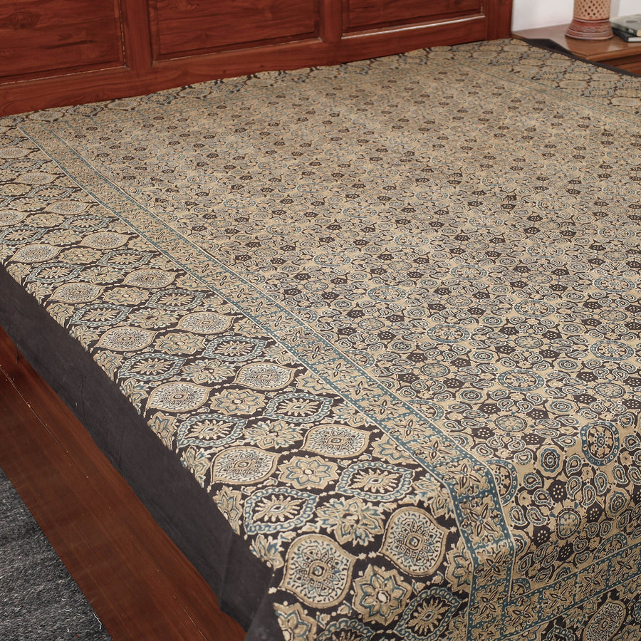 Fine quality ajrakh block printed cotton double bed cover made using natural dyes through traditional process of hand block printing practised by the master artisans in Kutch region of Gujarat. Ajrakh is a traditional vegetable dyeing and resist block-printing technique on cloth. It is estimated to be around 4,500 years old. The Ajrakh artisans in India are originally from Sindh and they migrated to Kutch in Gujarat and Barmer in Rajasthan. Ajrakh is the traditional attire of the Maldhari pastoral community of Bhuj. The process of 'Ajrakh' is a long drawn process with many stages and each layer of colour is printed after a gap of time so the cloth has to stay for the day.