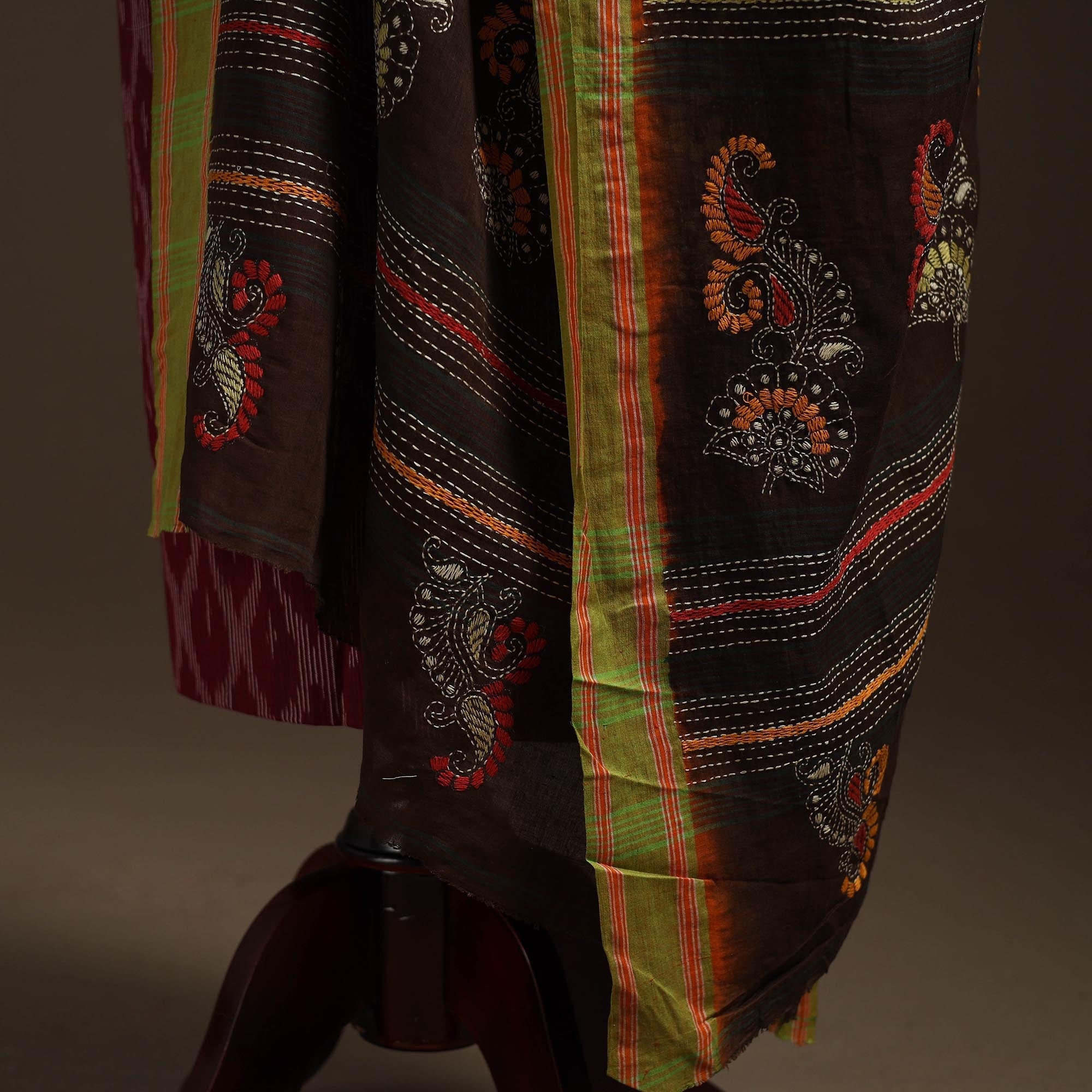 Fine quality brown hand embroidered pure cotton handloom dupatta using Bengal's traditional craft technique of kantha done by master artisan Takdira Begum from Bolpur, West Bengal.