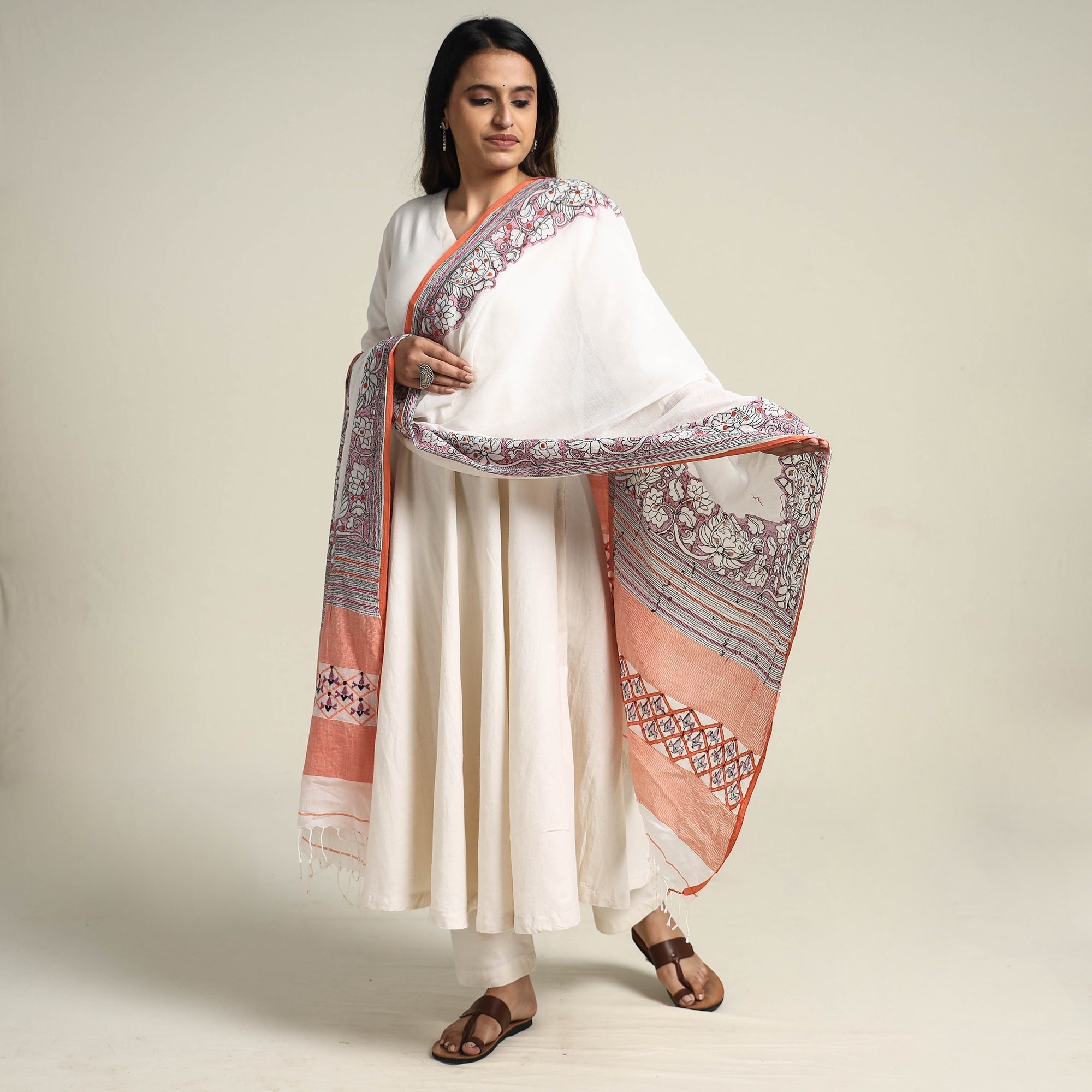 Fine quality hand embroidered pure cotton handloom dupatta using Bengal's traditional craft technique of kantha done by master artisan Takdira Begum from Bolpur, West Bengal.