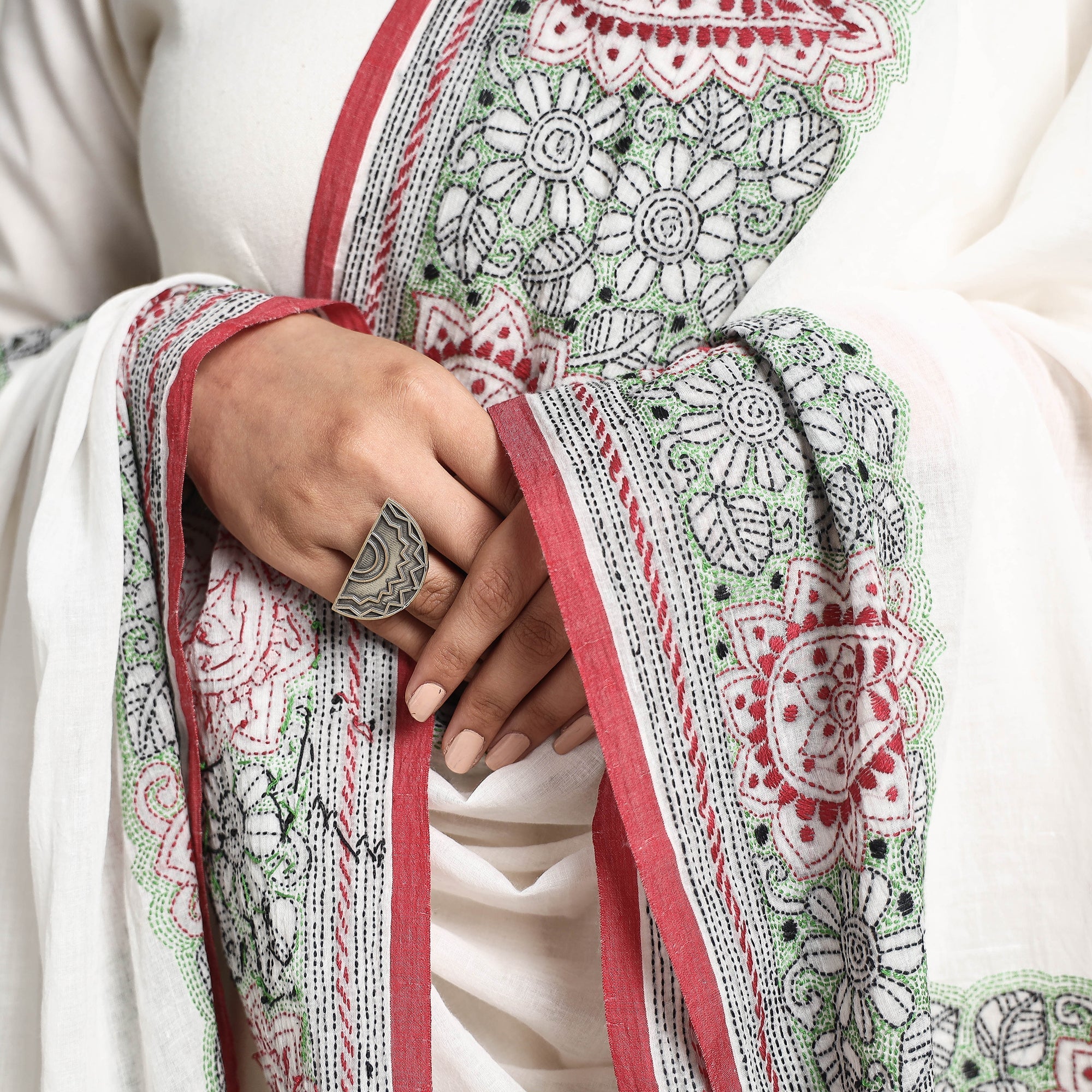Kantha Embroidery is a centuries-old tradition where people stitch patchwork cloth from rags that was evolved from the thrift of rural women in the Bengali region of the sub-continent