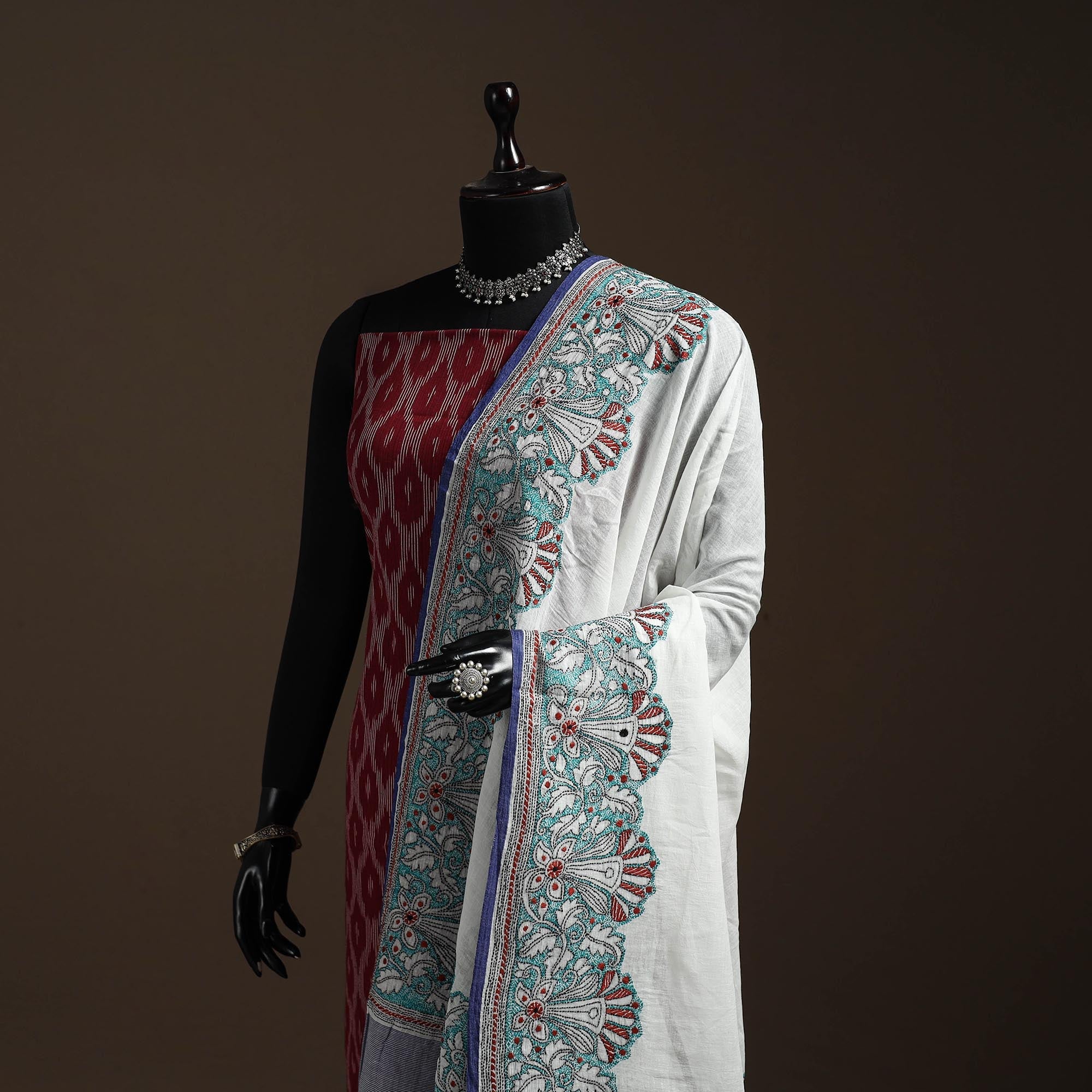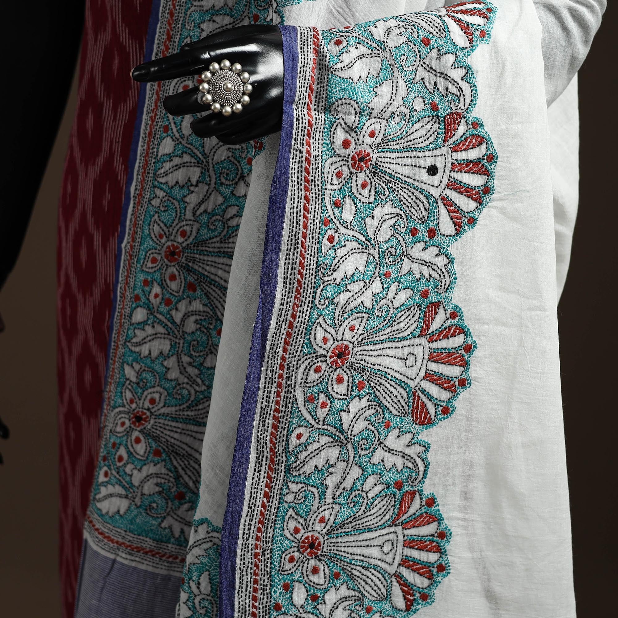 Fine quality white hand embroidered pure cotton handloom dupatta using Bengal's traditional craft technique of kantha done by master artisan Takdira Begum from Bolpur, West Bengal.