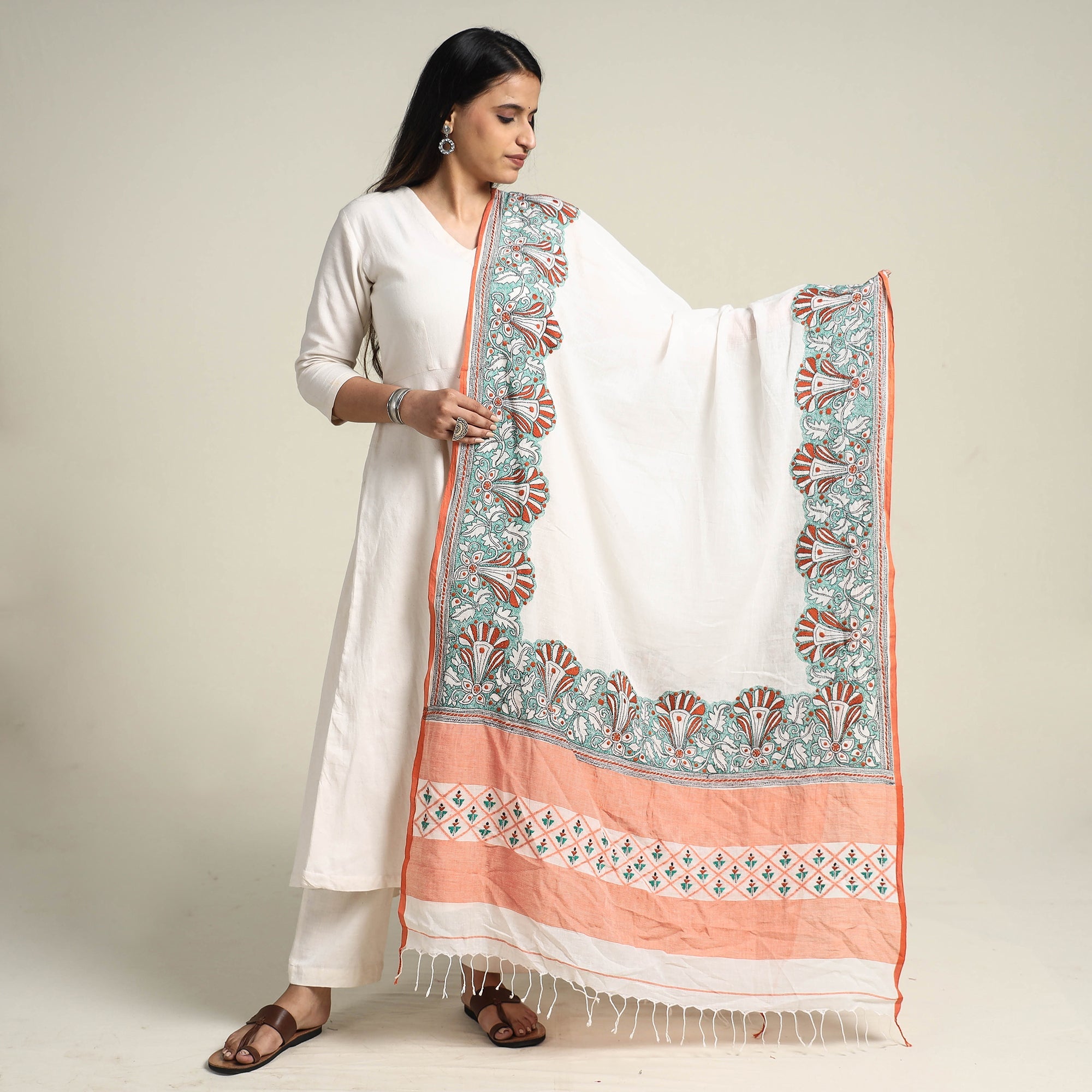Fine quality hand embroidered pure cotton handloom dupatta using Bengal's traditional craft technique of kantha done by master artisan Takdira Begum from Bolpur, West Bengal.