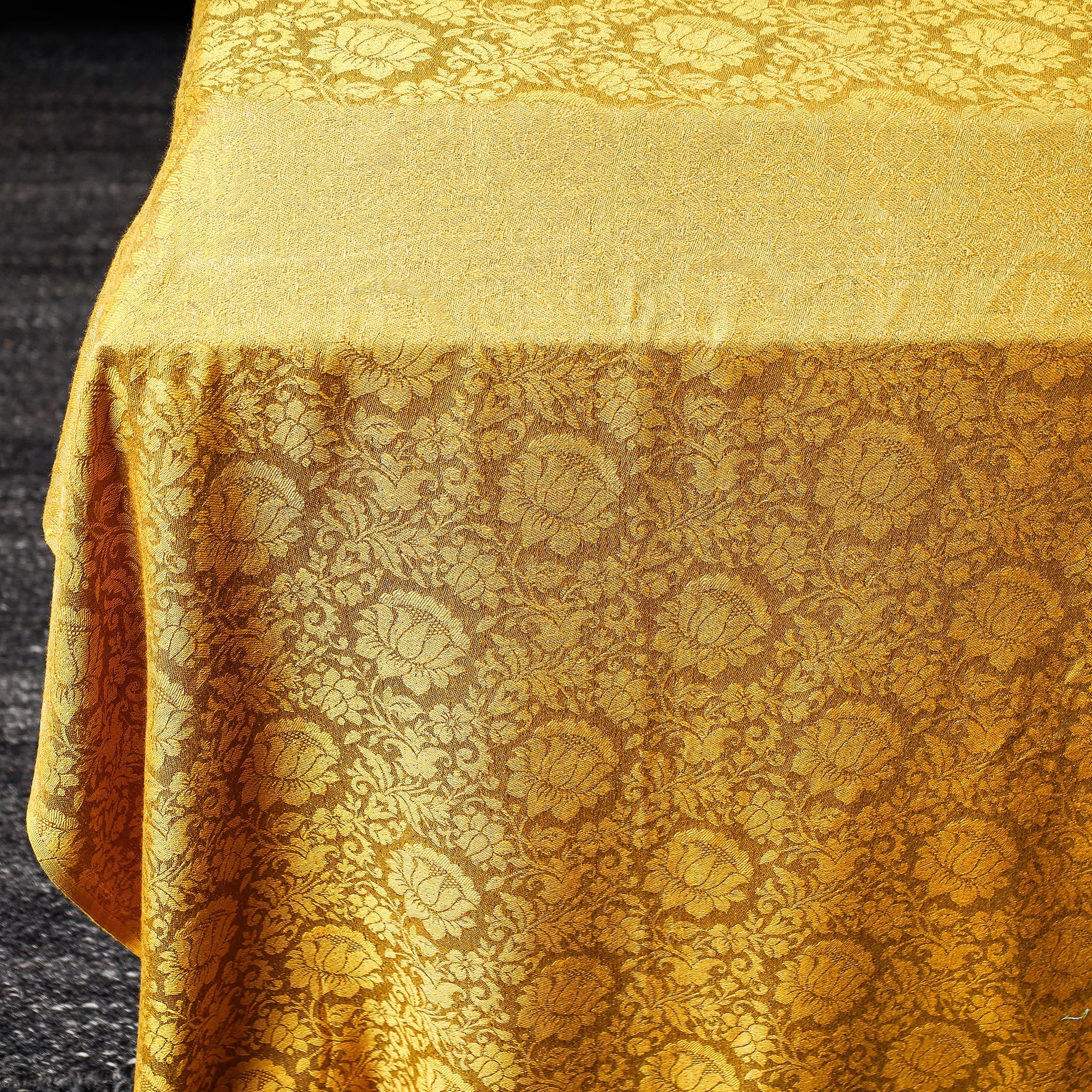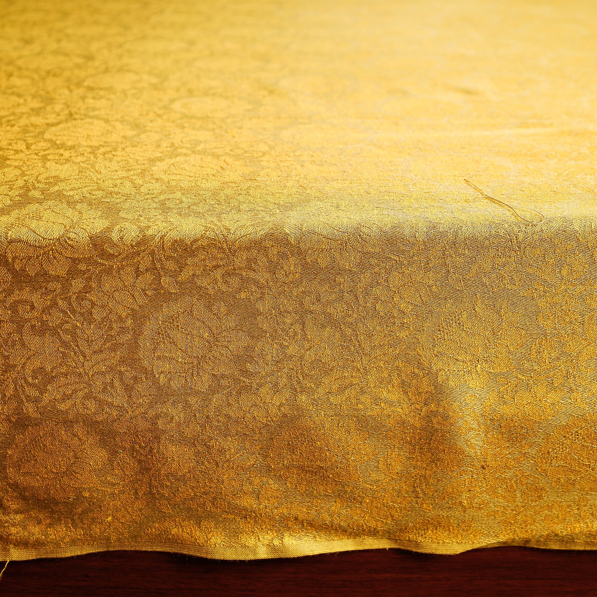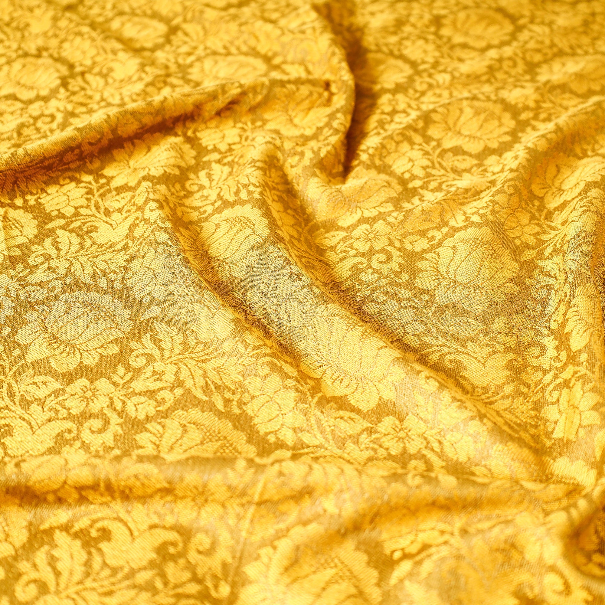 This traditional yellow jacquard handloom himroo mercerized cotton double bedcover is made by craftsmen and women in the Aurangabad region of Maharashtra. The artisans employ the traditional Himroo weaving technique, which is known for its intricate patterns and luxurious textures. The process involves carefully interlacing the mercerized cotton threads on a handloom, resulting in a beautifully woven fabric with exceptional craftsmanship. 'Himroo' material is a traditional Aurangabad specialty. Himroo may be woven with silk, wool, cotton, or zari (silver-gold thread), which is grown locally in Aurangabad. Himroo uses Persian designs and is very characteristic and distinctive in appearance.
