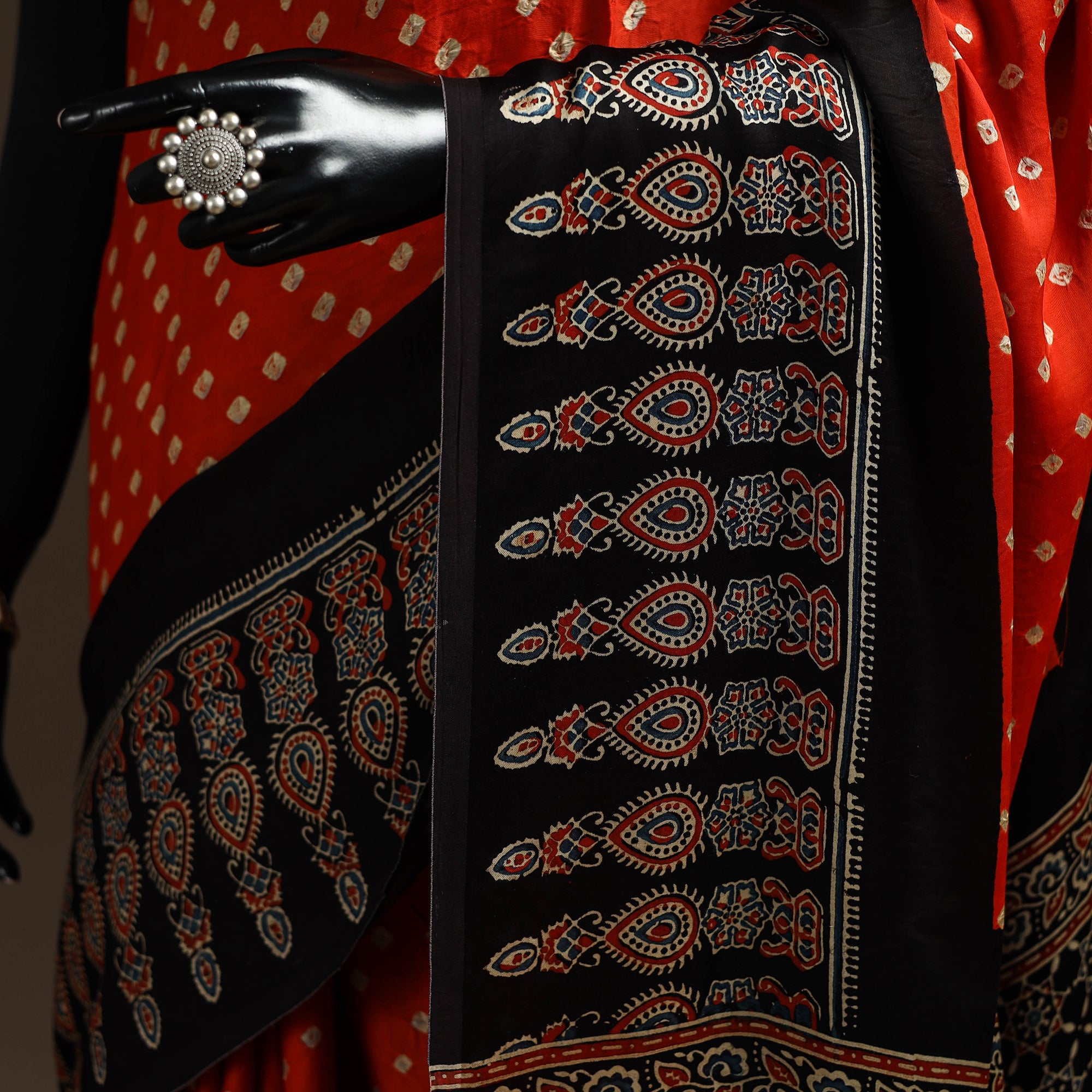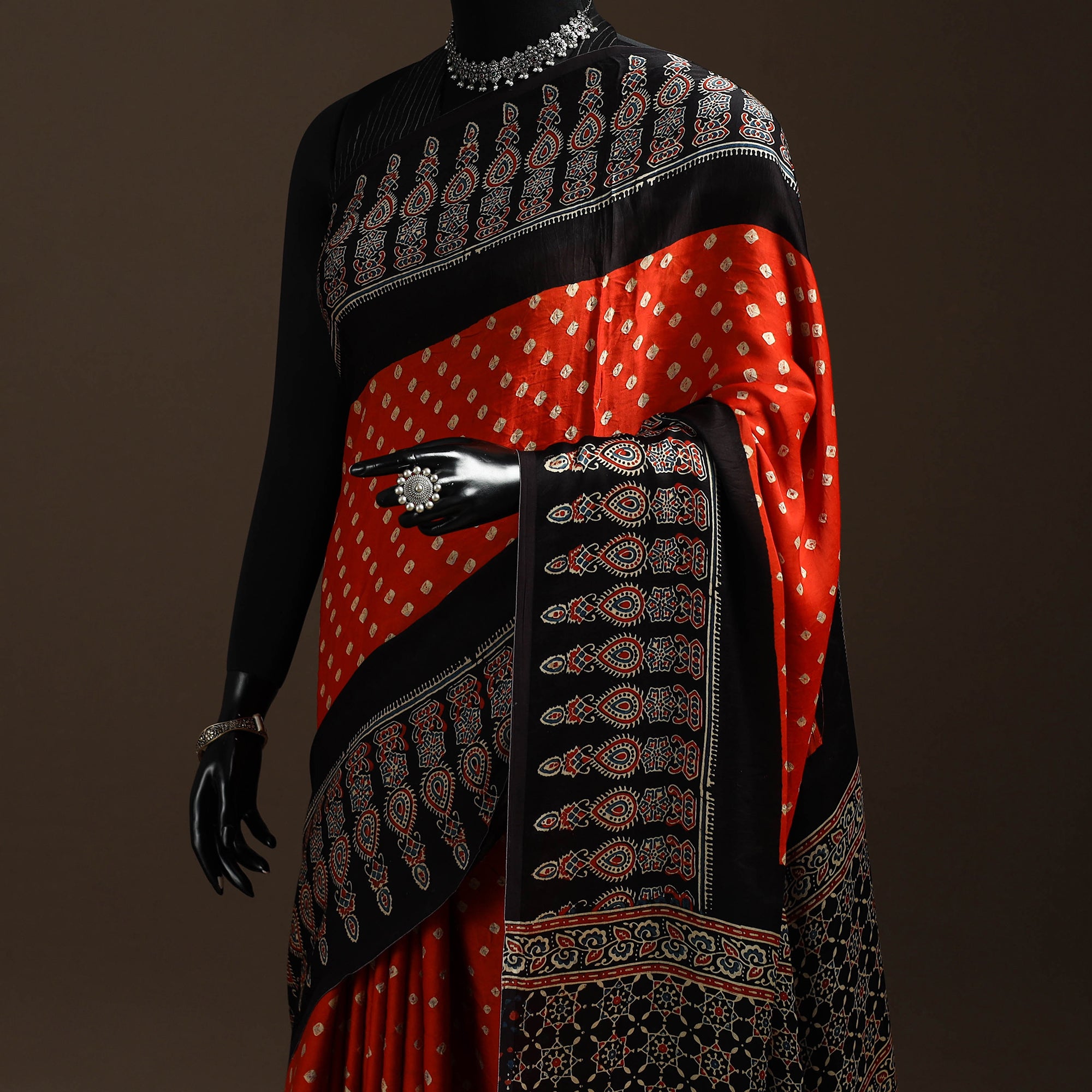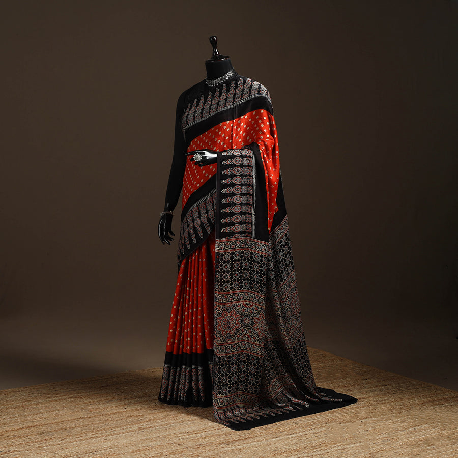This exquisite orange bandhani block printed ajrakh modal silk saree is crafted from luxurious modal silk, a fabric known for its softness and lustrous sheen. Meticulously hand block printed using the traditional ajrakh technique, this saree showcases the artistic skills of the skilled artisans from the Kutch region of Gujarat. Each intricate design is carved onto wooden blocks, which are then dipped in natural dyes and carefully imprinted onto the fabric. Combining the artistic techniques of Ajrakh and Bandhani, this saree showcases a harmonious blend of traditional craftsmanship.