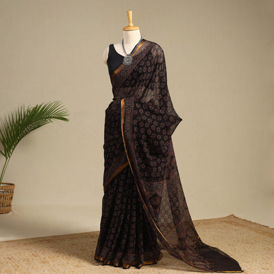 This exquisite black bandhani block printed ajrakh modal silk saree is crafted from luxurious modal silk, a fabric known for its softness and lustrous sheen. Meticulously hand block printed using the traditional ajrakh technique, this saree showcases the artistic skills of the skilled artisans from the Kutch region of Gujarat. Each intricate design is carved onto wooden blocks, which are then dipped in natural dyes and carefully imprinted onto the fabric. Combining the artistic techniques of Ajrakh and Bandhani, this saree showcases a harmonious blend of traditional craftsmanship.