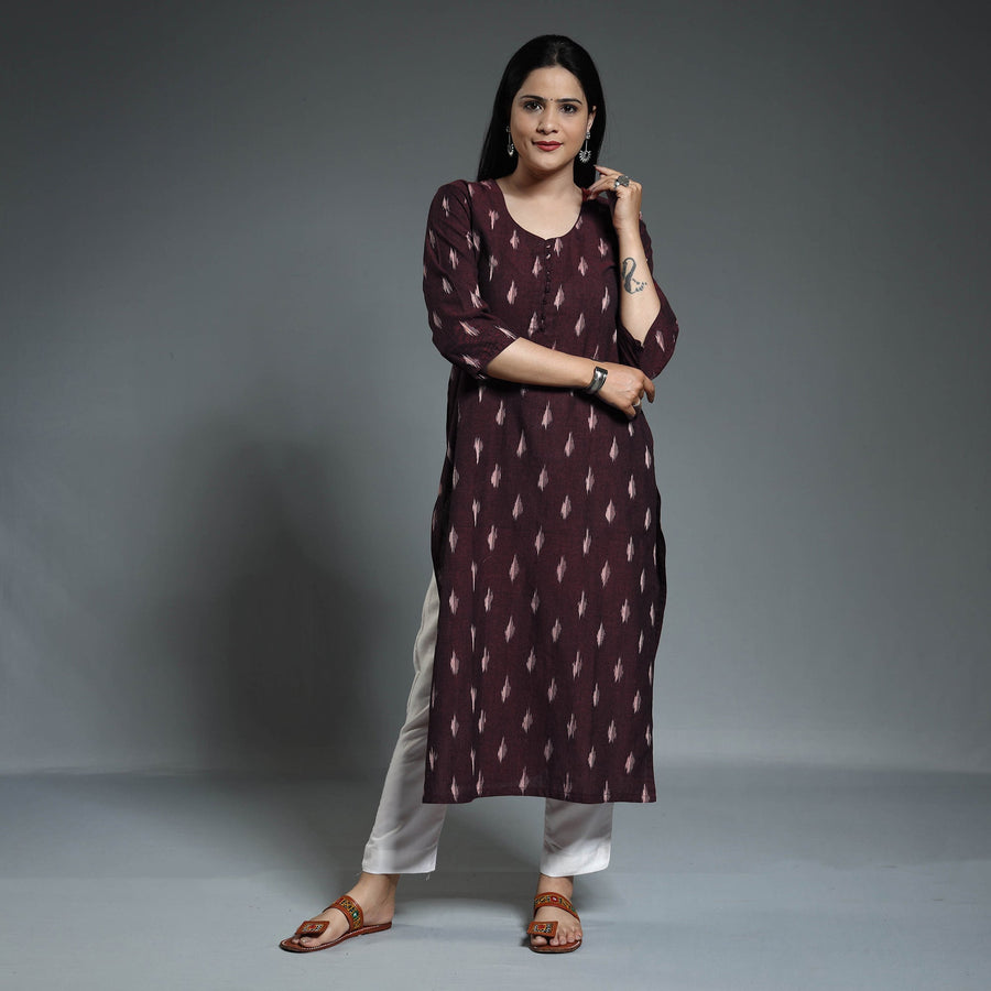 Experience the beauty of Indian Ikat with this pochampally ikat weave cotton long kurta. Crafted from high-quality cotton, it offers comfort and breathability all day long. The vibrant ikat patterns in beautiful colours make it a standout piece. With its long length and side pocket, it combines style and functionality. With its comfortable fit and unique detailing, this kurta is perfect for your daily outing and for a special occasion.