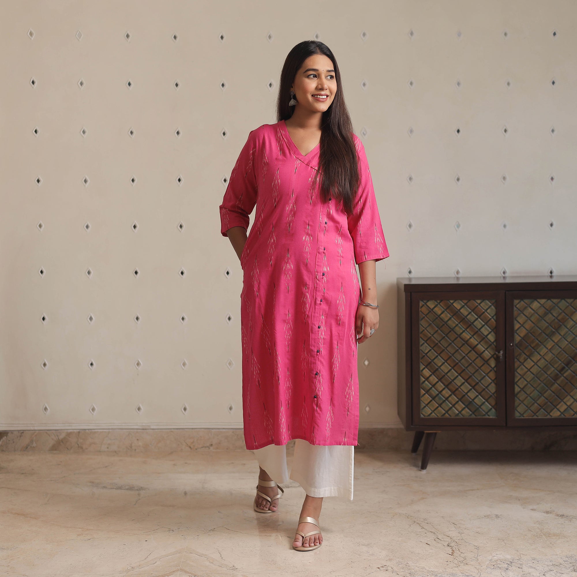 Experience the beauty of Indian Ikat with this pochampally ikat weave cotton long Kurta. Crafted from high-quality cotton, it offers comfort and breathability all day long. The vibrant ikat patterns in beautiful colours make it a standout piece. With its long length and side pocket, it combines style and functionality. With its comfortable fit and unique detailing, this Kurta is perfect for your daily outing and for a special occasion.