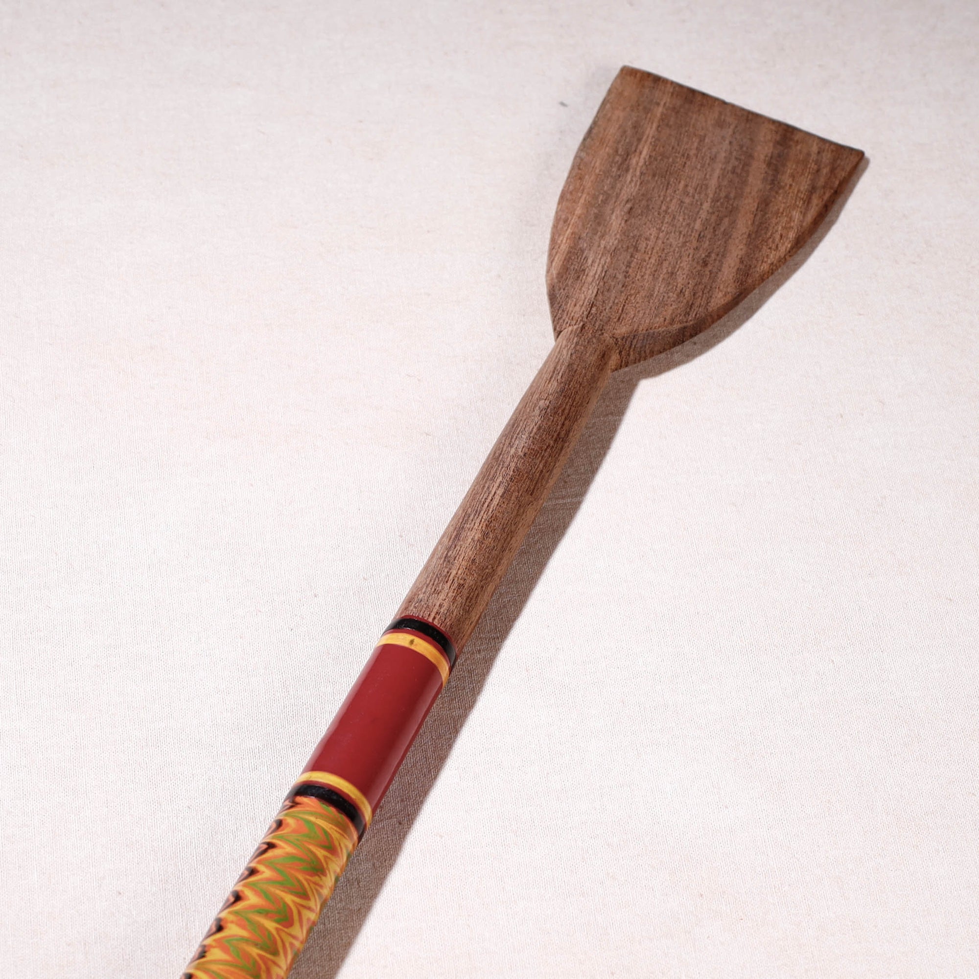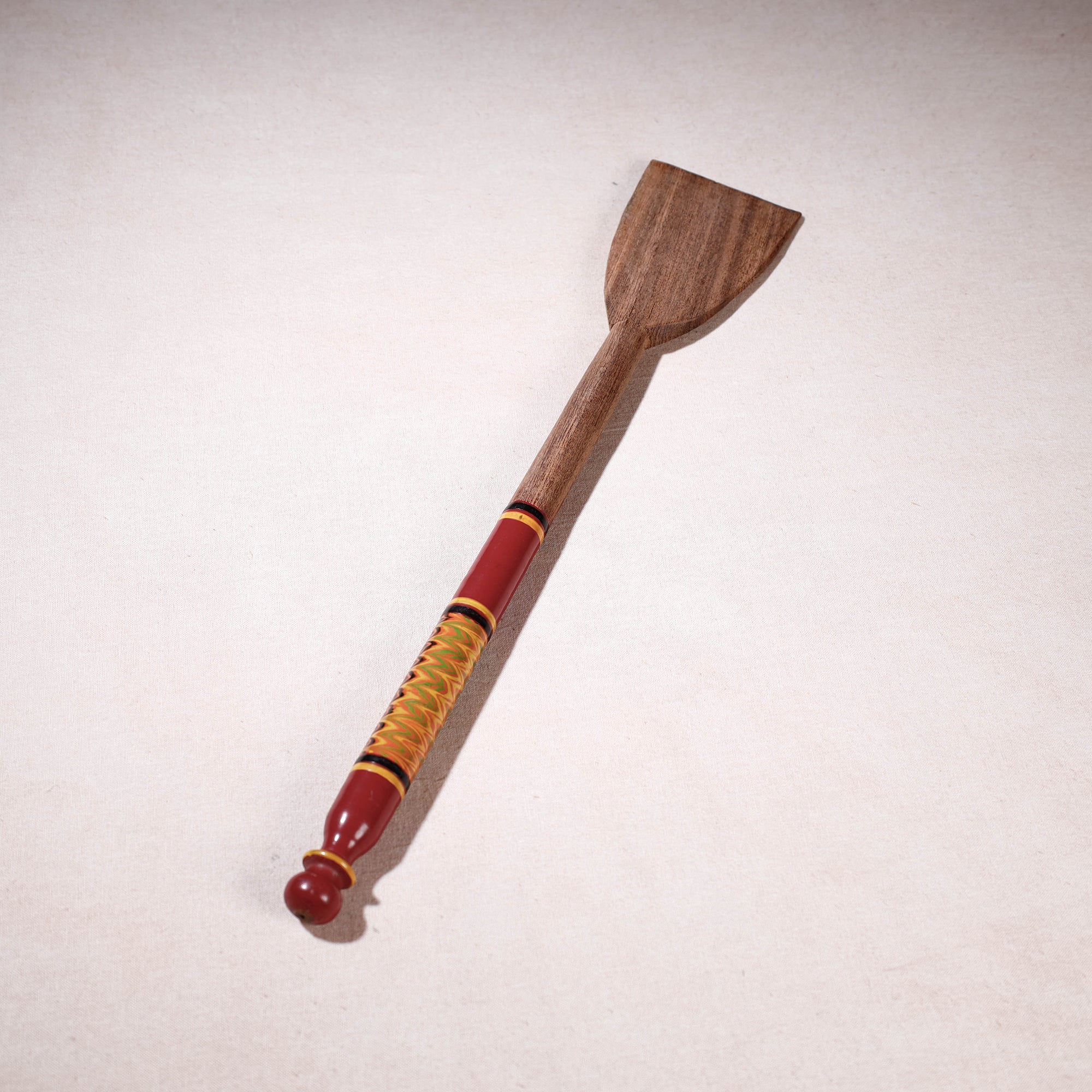 This exquisitely handcrafted cooking spatula is made of babool wood with lacquered colours. This spatula is meticulously handcrafted by skilled artisans from the Vadha community in villages like Nirona and Jura. They begin by selecting babool wood, which is known for its durability and strength. Layers of coloured lacquer are applied to the wood, and intricate designs and effects are chiselled to create a stunning visual appeal.