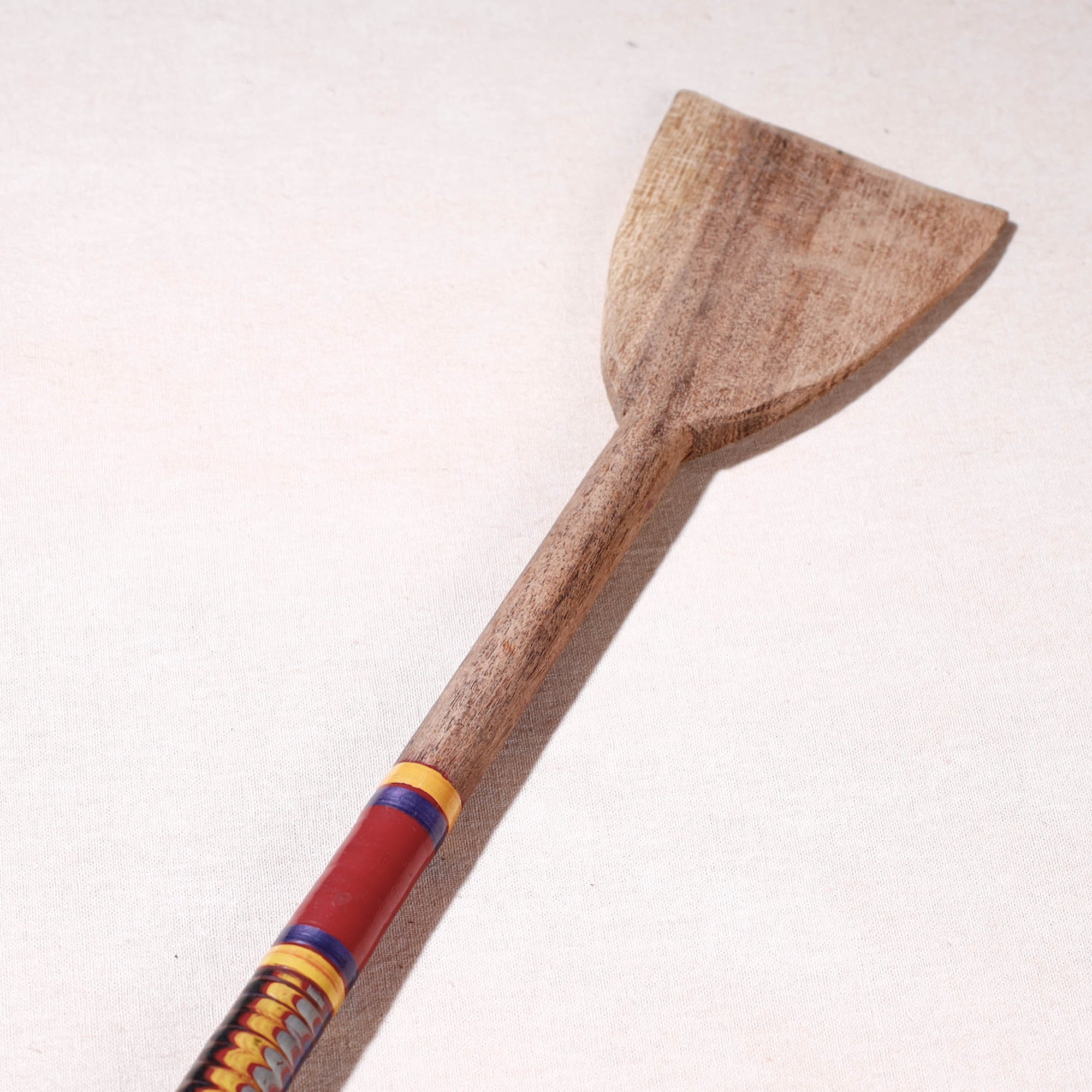 This exquisitely handcrafted cooking spatula is made of babool wood with lacquered colours. This spatula is meticulously handcrafted by skilled artisans from the Vadha community in villages like Nirona and Jura. They begin by selecting babool wood, which is known for its durability and strength. Layers of coloured lacquer are applied to the wood, and intricate designs and effects are chiselled to create a stunning visual appeal.