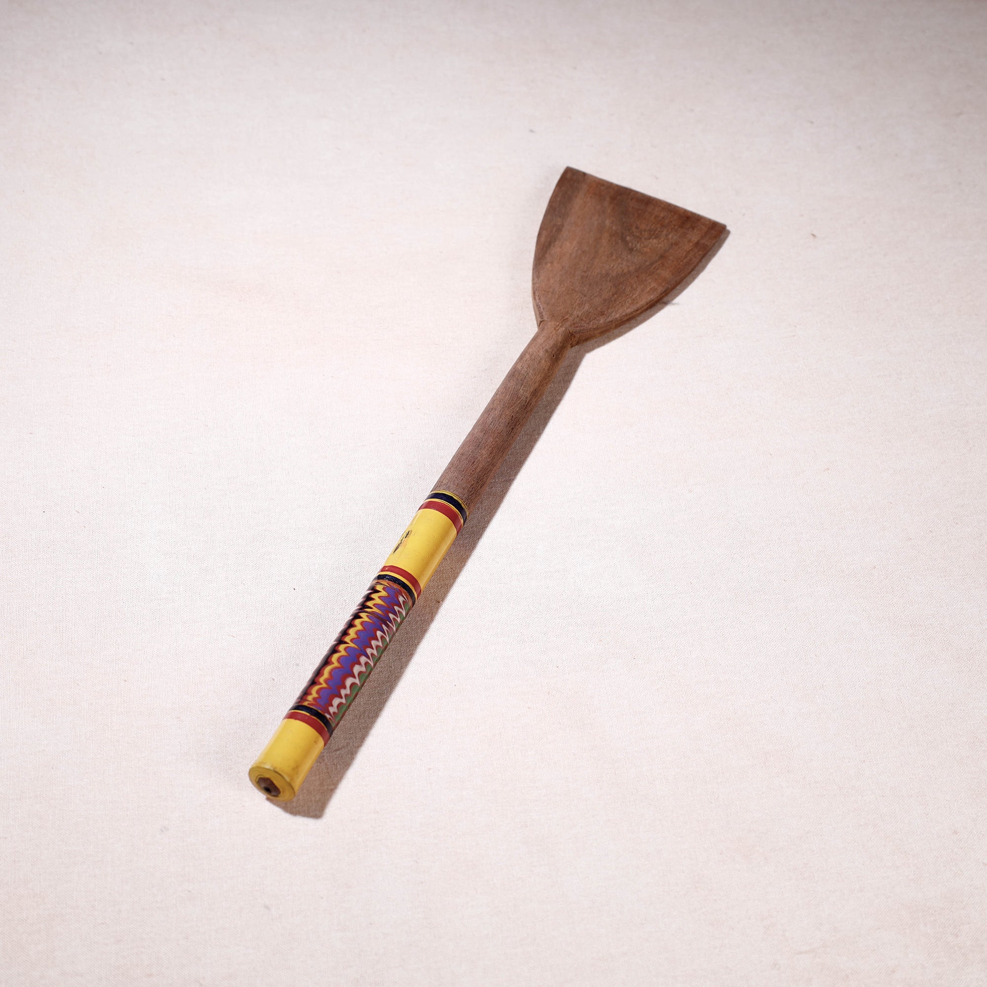 This exquisitely handcrafted cooking spatula is made of babool wood with lacquered colours. This spatula is meticulously handcrafted by skilled artisans from the Vadha community in villages like Nirona and Jura. They begin by selecting babool wood, which is known for its durability and strength. Layers of coloured lacquer are applied to the wood, and intricate designs and effects are chiselled to create a stunning visual appeal.