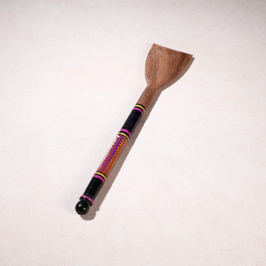 This exquisitely handcrafted cooking spatula is made of babool wood with lacquered colours. This spatula is meticulously handcrafted by skilled artisans from the Vadha community in villages like Nirona and Jura. They begin by selecting babool wood, which is known for its durability and strength. Layers of coloured lacquer are applied to the wood, and intricate designs and effects are chiselled to create a stunning visual appeal.