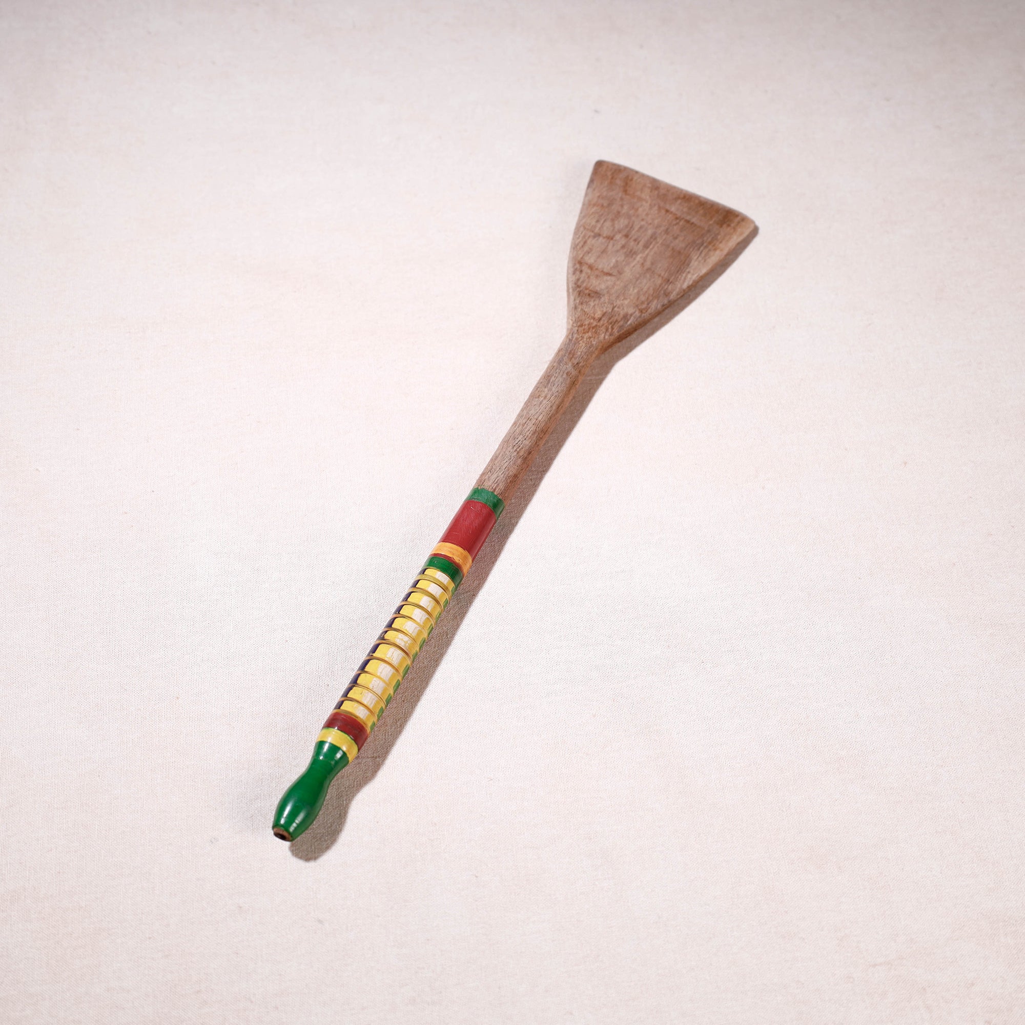 This exquisitely handcrafted cooking spatula is made of babool wood with lacquered colours. This spatula is meticulously handcrafted by skilled artisans from the Vadha community in villages like Nirona and Jura. They begin by selecting babool wood, which is known for its durability and strength. Layers of coloured lacquer are applied to the wood, and intricate designs and effects are chiselled to create a stunning visual appeal.