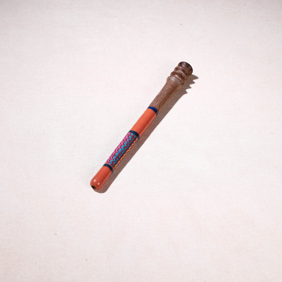 This exquisite handcrafted honey serving spoon is made of babool wood with lacquered colours. This spoon is meticulously handcrafted by skilled artisans from the Vadha community in villages like Nirona and Jura. They begin by selecting babool wood, which is known for its durability and strength. Layers of coloured lacquer are applied to the wood, and intricate designs and effects are chiselled to create a stunning visual appeal.